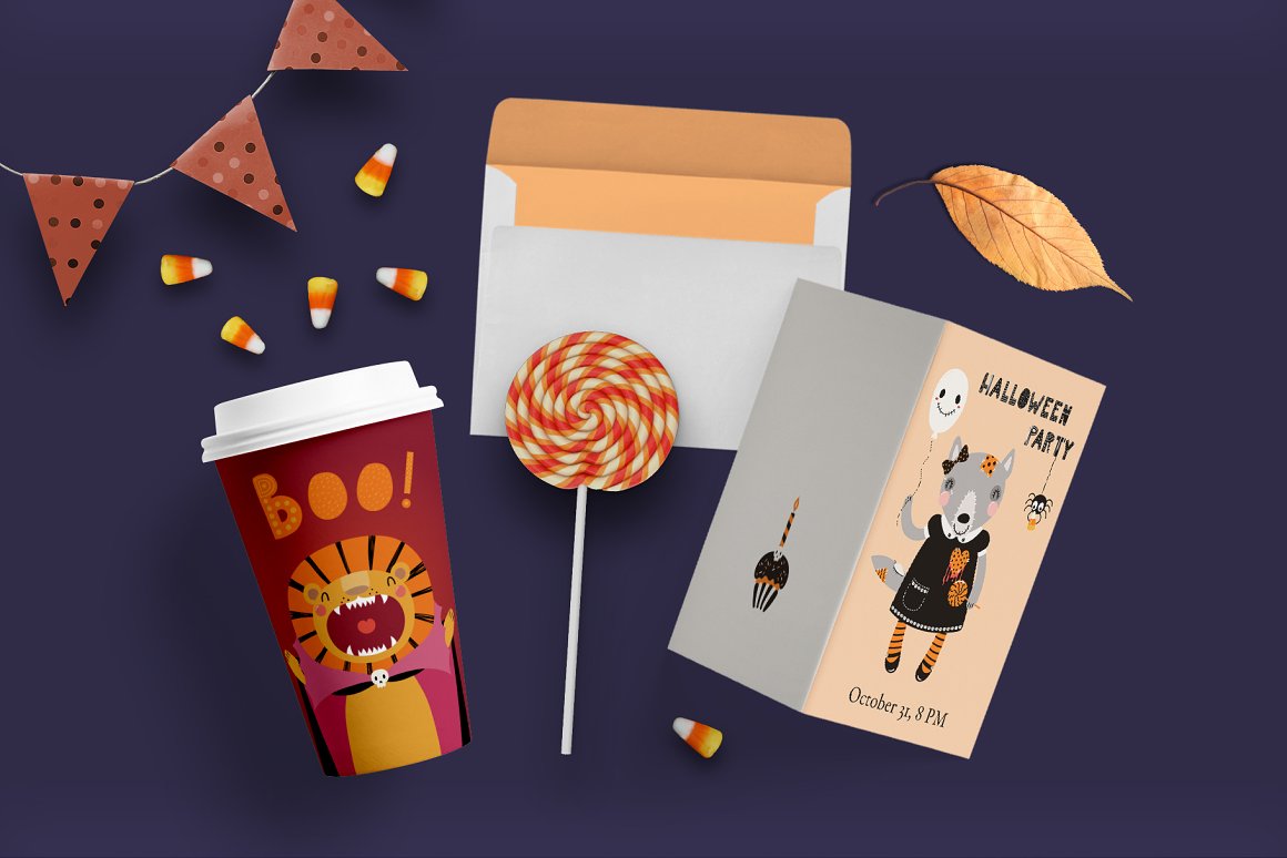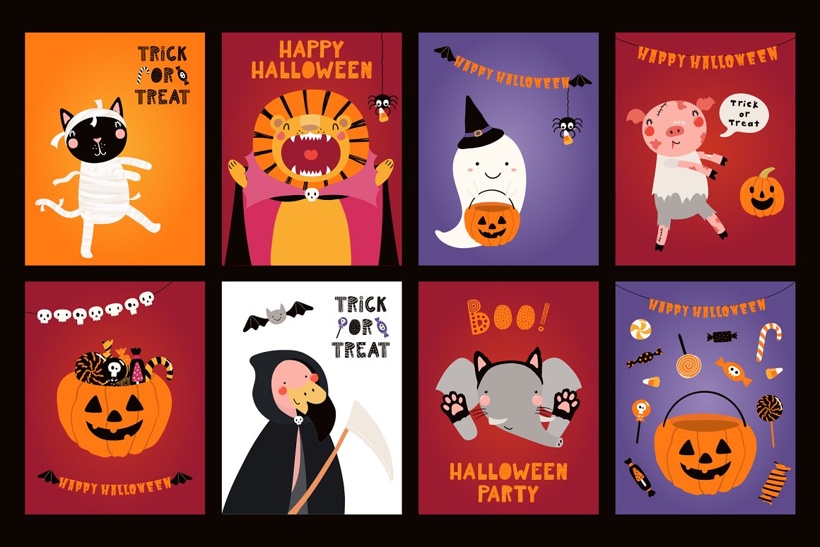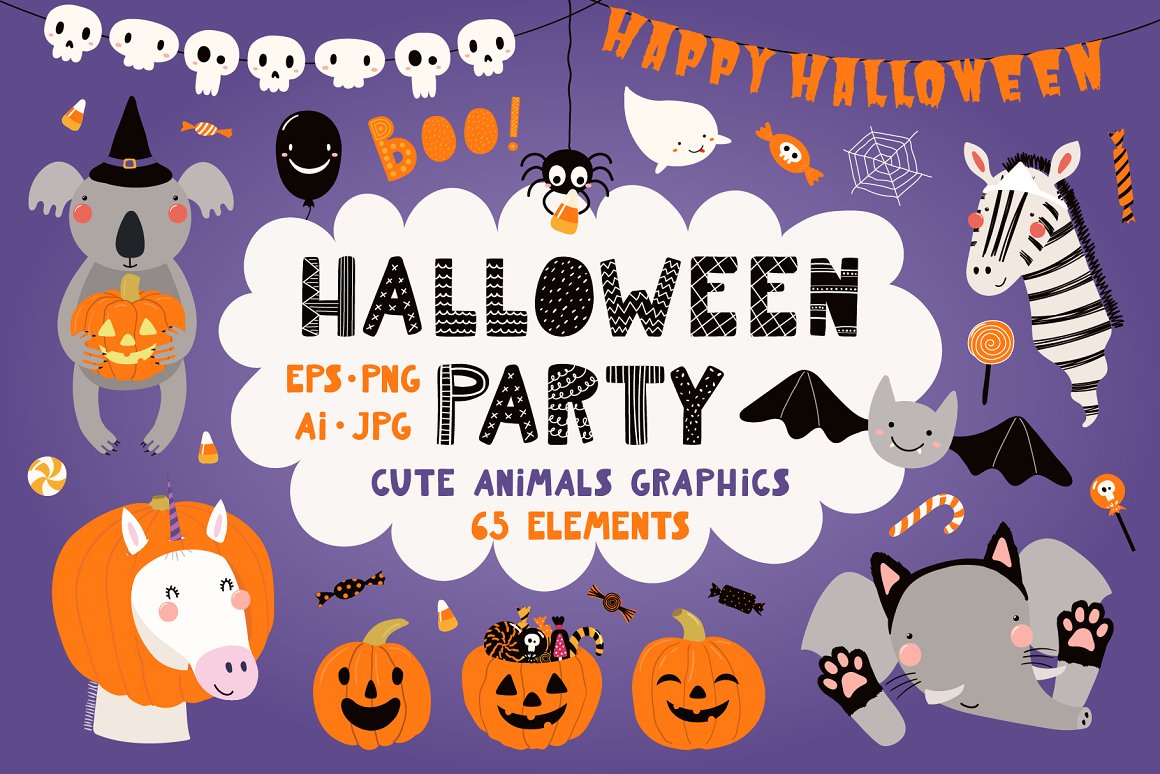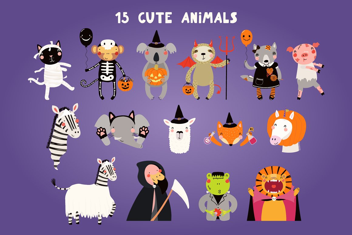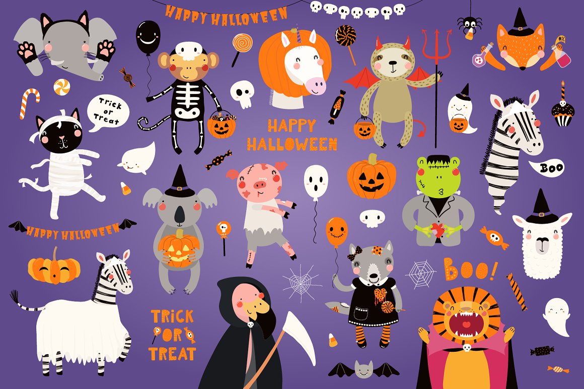 Halloween vector illustrations set with adorable animals in Halloween costumes, jack o lantern pumpkins, ghosts, candy, bat, spider webs, skulls, balloons, bunting clipart, inspired by Scandinavian design and Japanese kawaii aesthetic. The collection also includes hand drawn alphabet, holiday quotes, 12 seamless patterns and pre-made designs. 65 unique graphic elements in total.