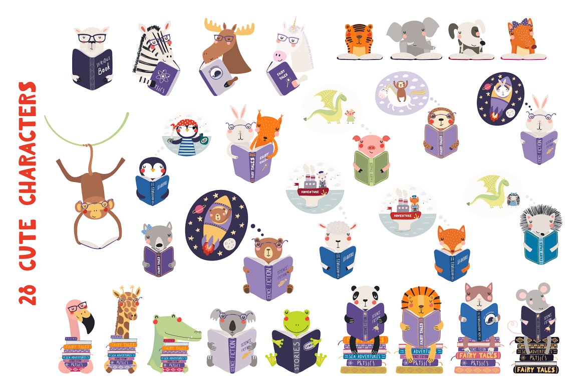 - 28 cute summer animals reading books (AI, EPS10, separate high resolution PNG on transparent background)