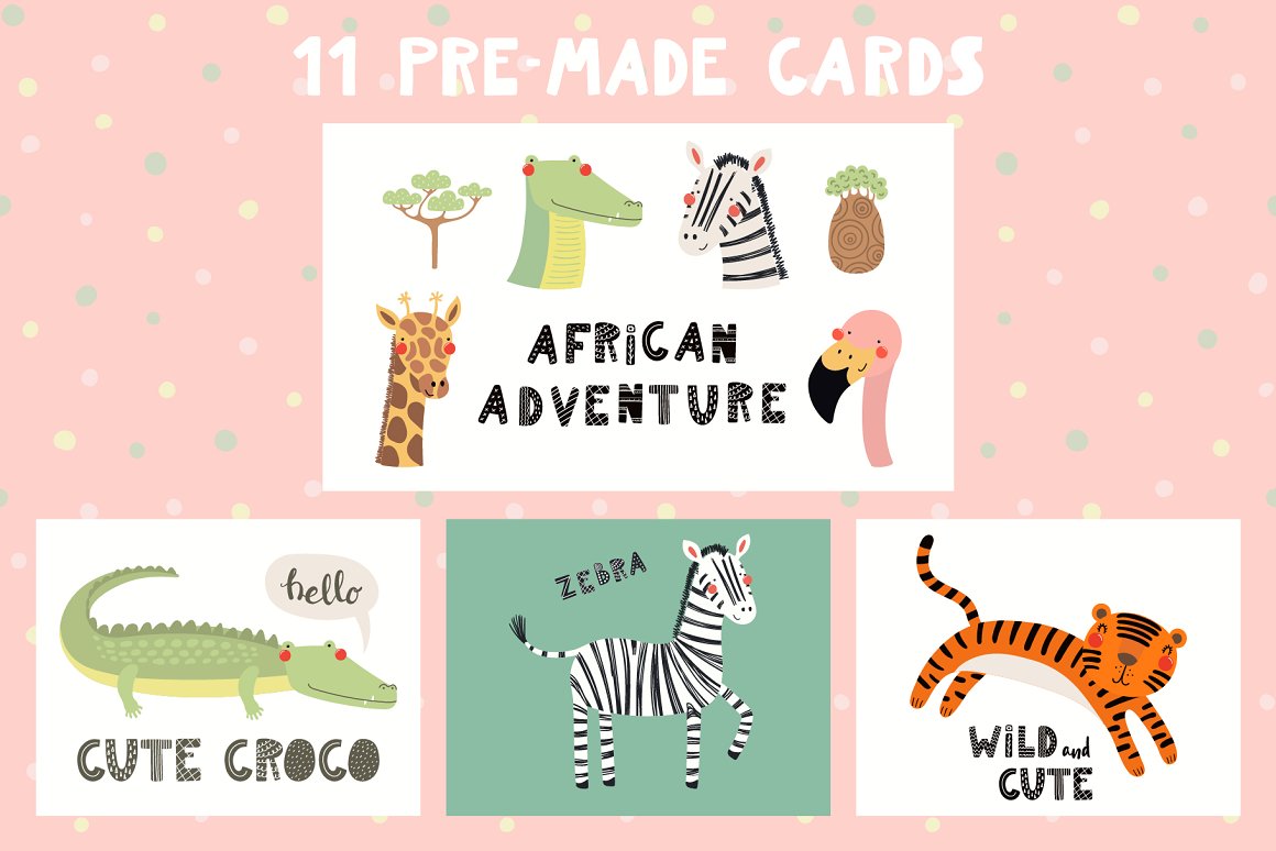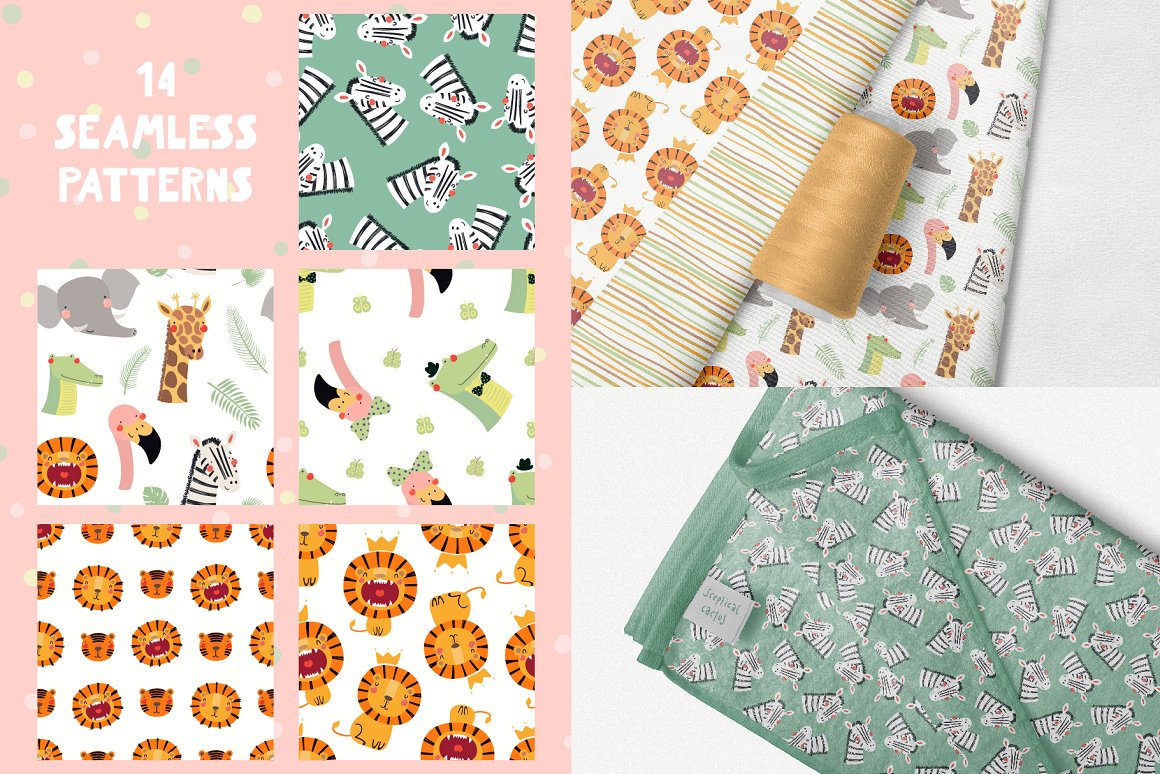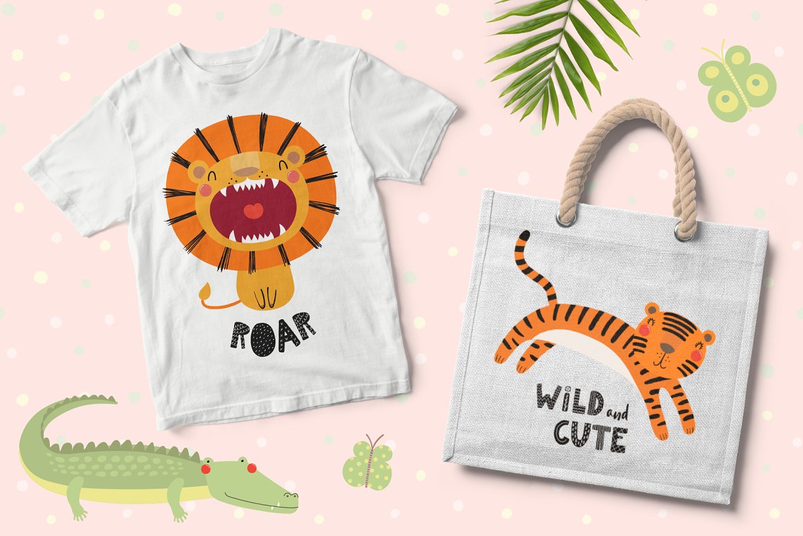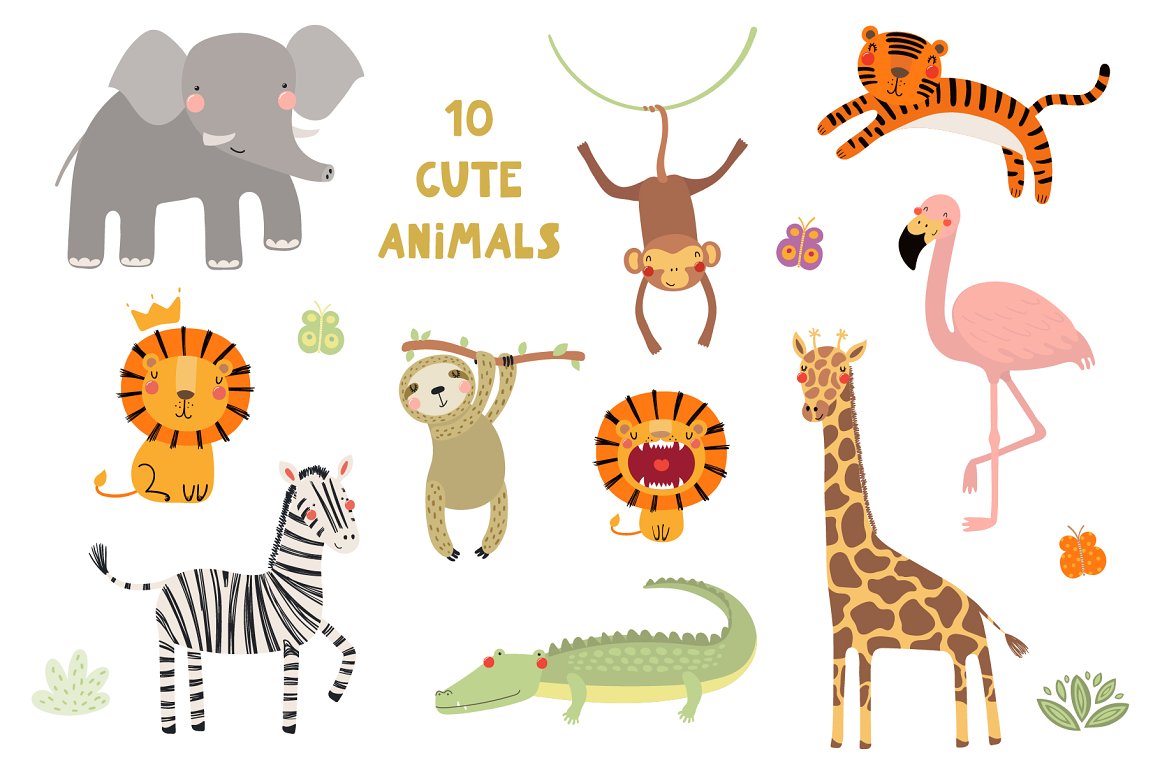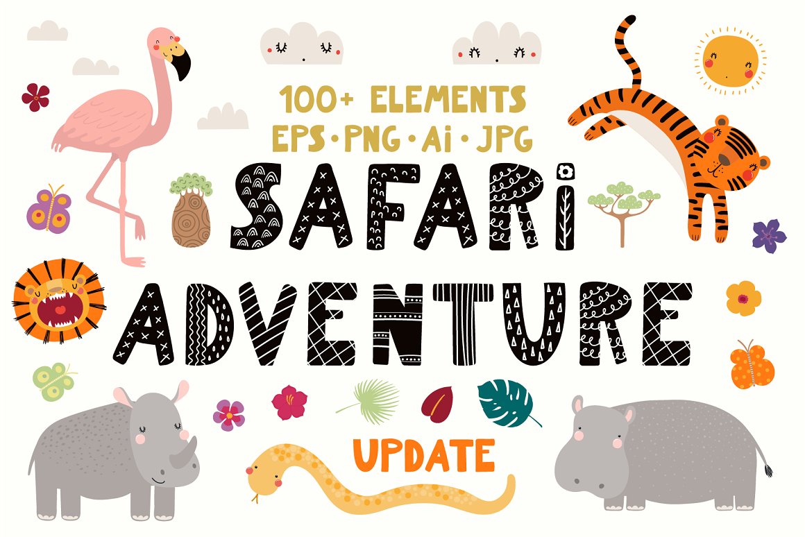 Let’s go on safari adventure! Inspired by Scandinavian design and Japanese kawaii aesthetic, here are 10 cute exotic animals – two lions, flamingo, zebra, monkey, crocodile, giraffe, tiger, elephant and sloth. With addition of tropical plants, hand drawn alphabet and 14 seamless patterns you can create lots and lots of baby and kids oriented design projects. 95 elements in total.