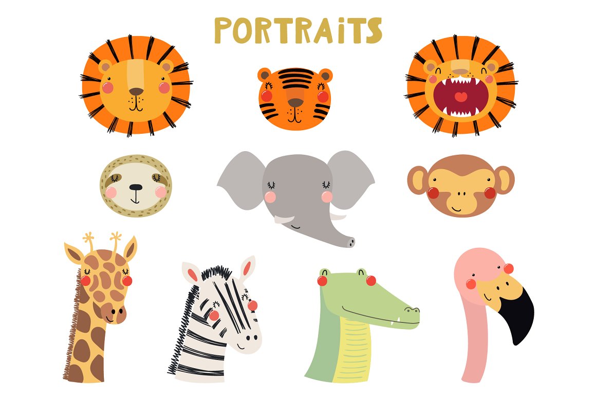 - 24 cute animals + 22 portraits (54 animal illustrations total, including variations) (AI, EPS10, separate high resolution PNG with transparent background)