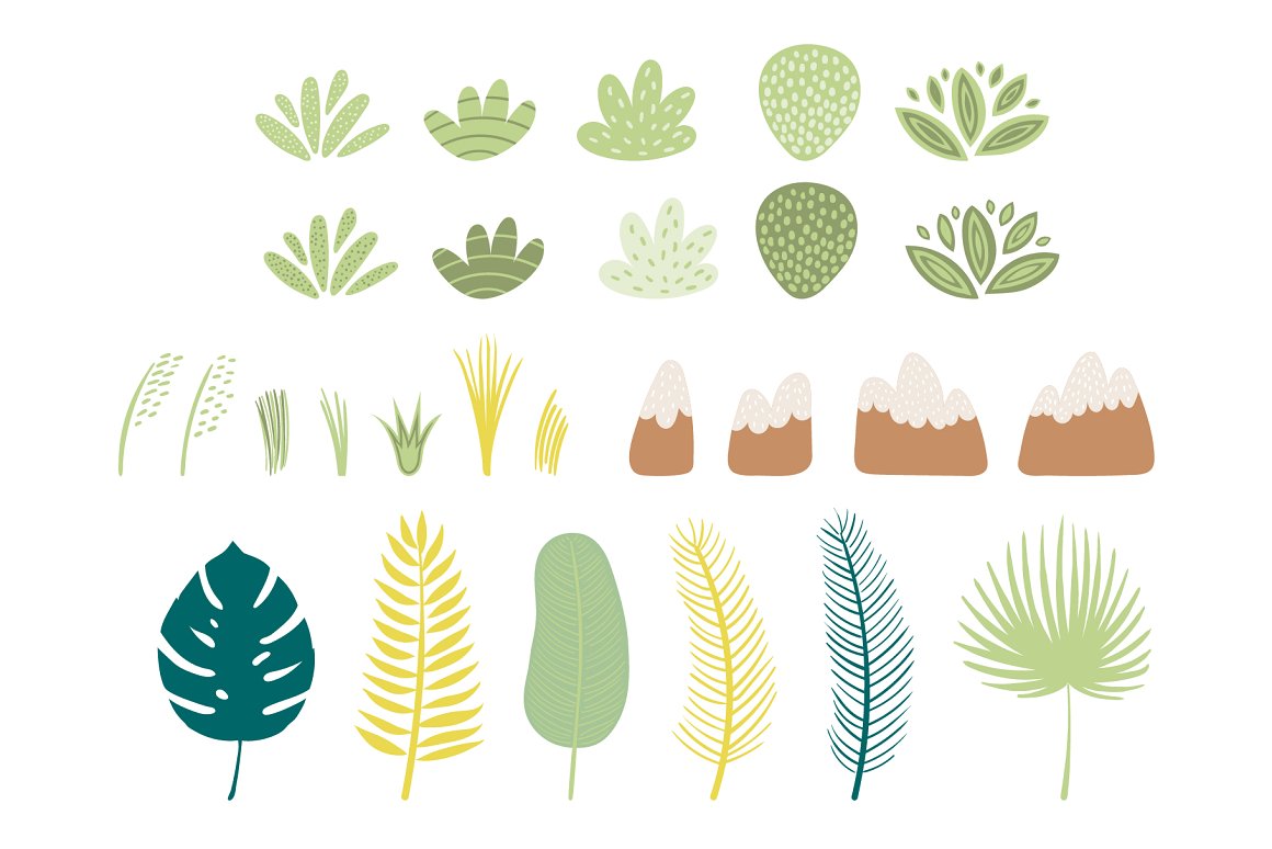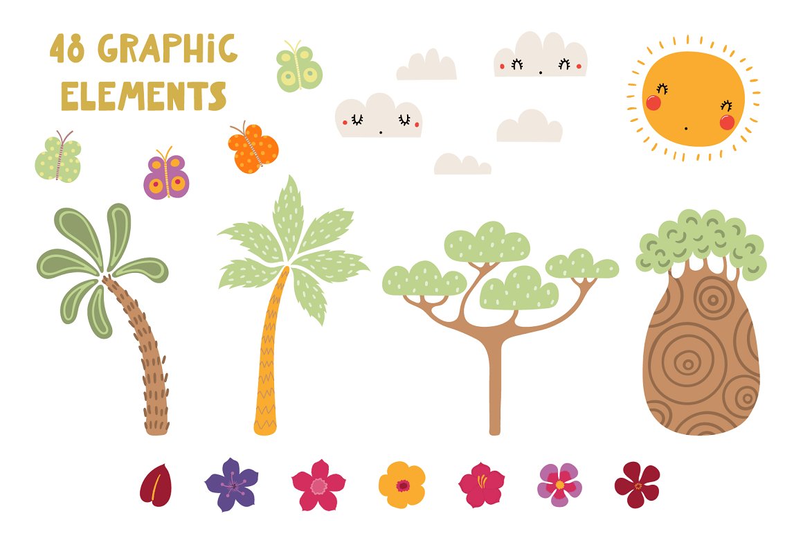 - 48 additional elements (sun, clouds, trees, plants, palm leaves, flowers, butterflies) (AI, EPS10, separate high resolution PNG with transparent background)
