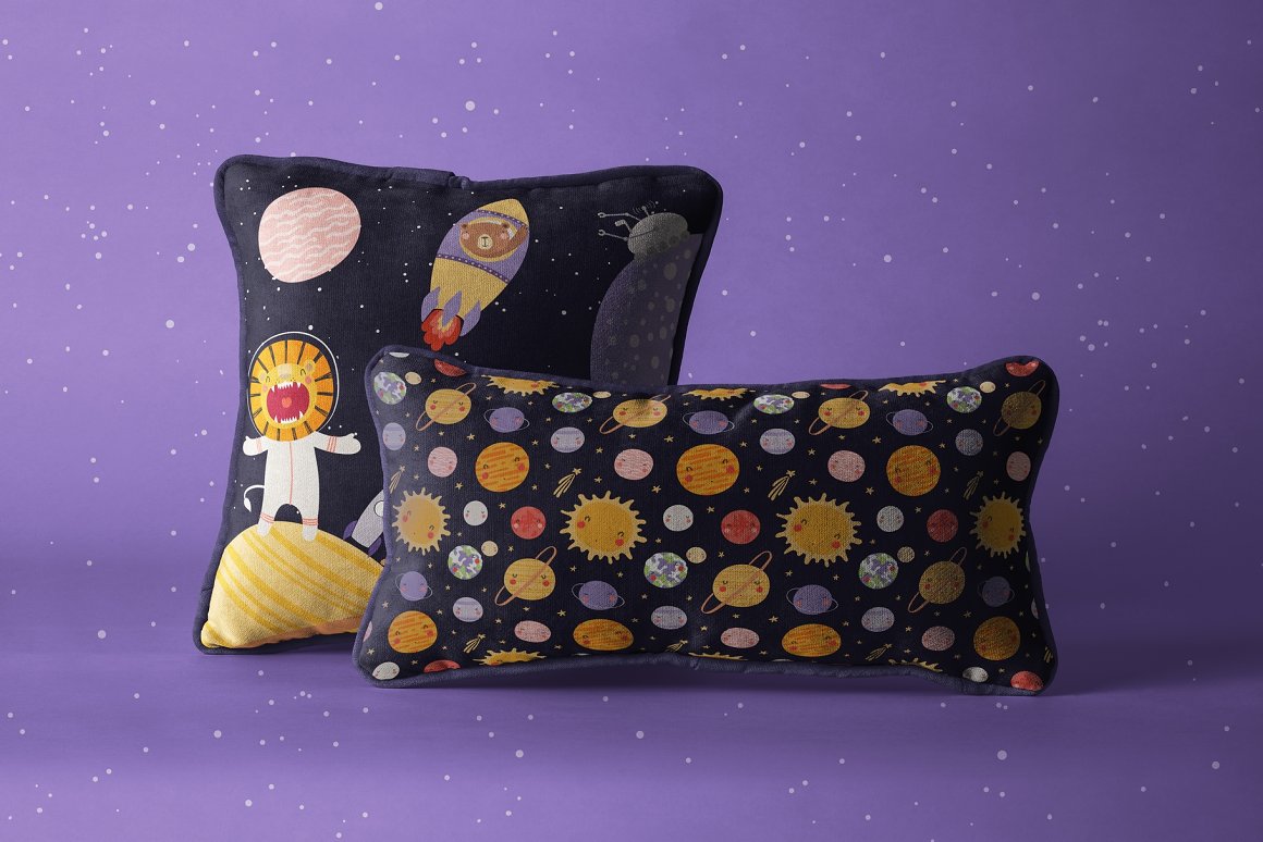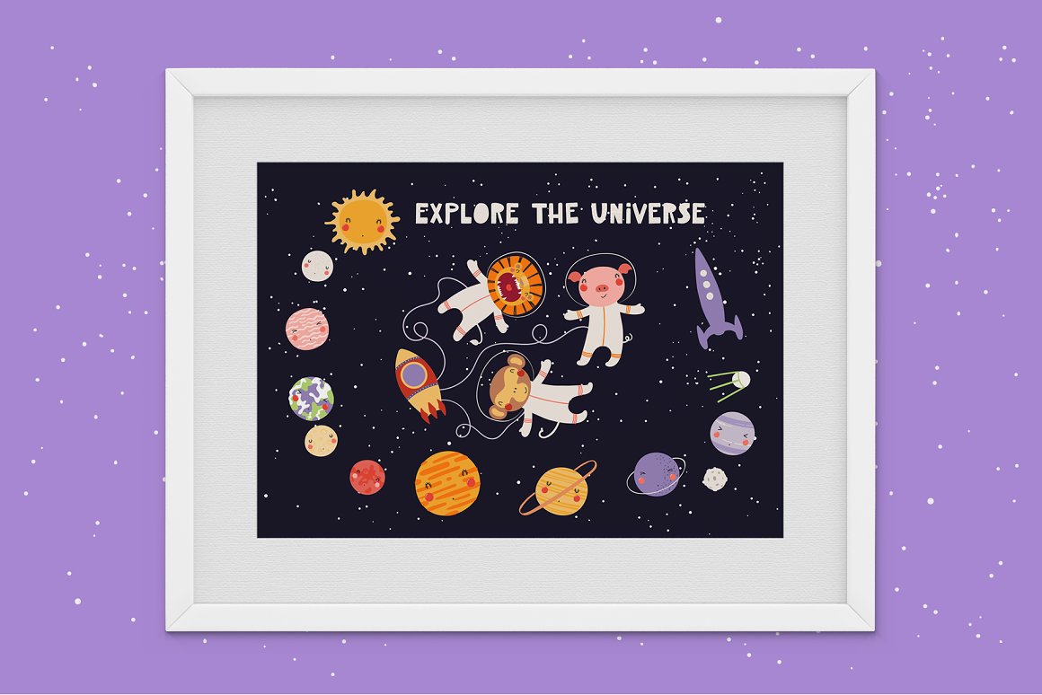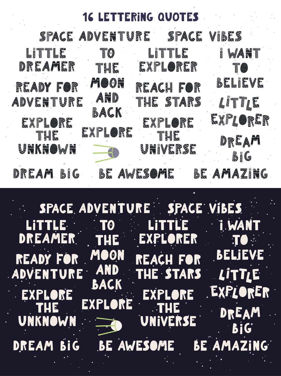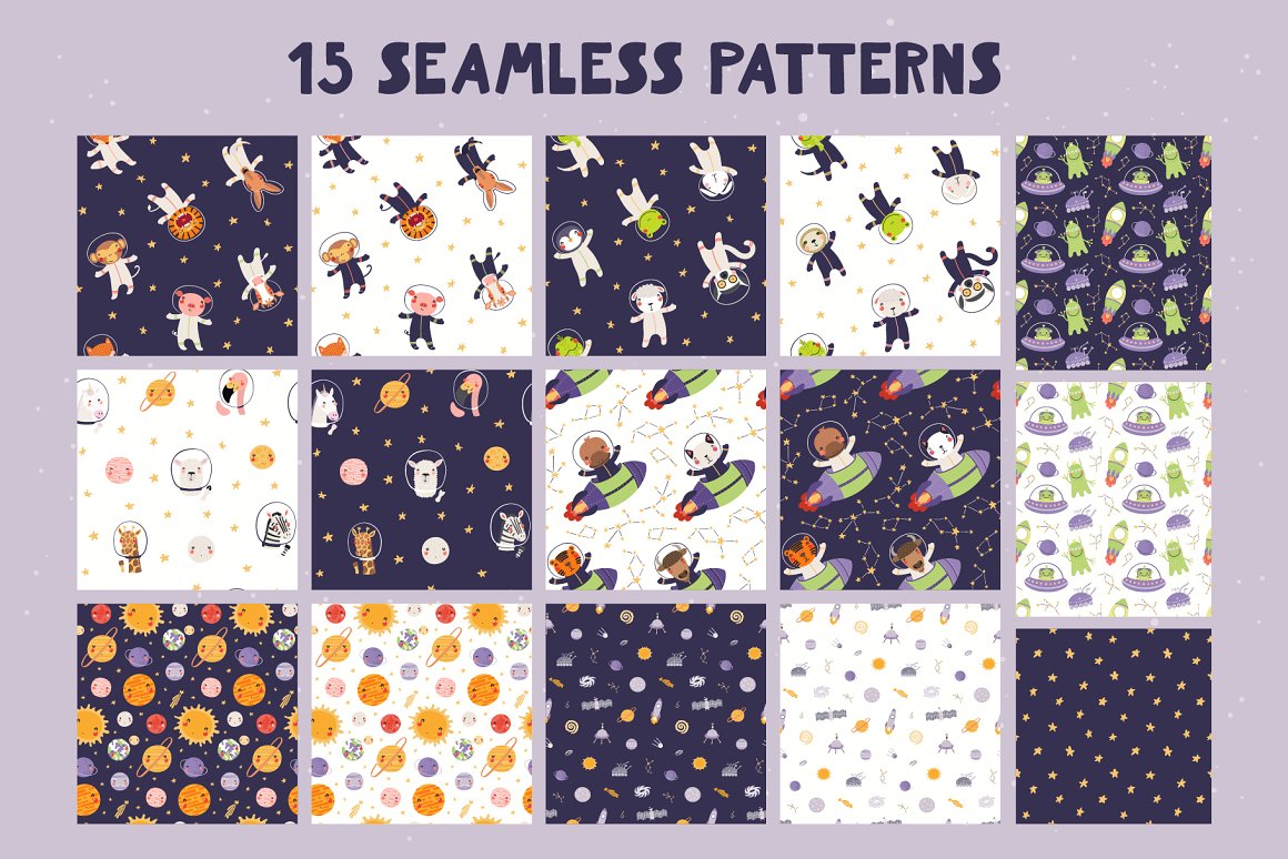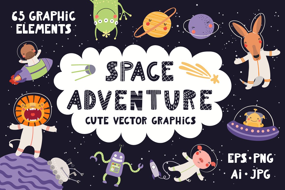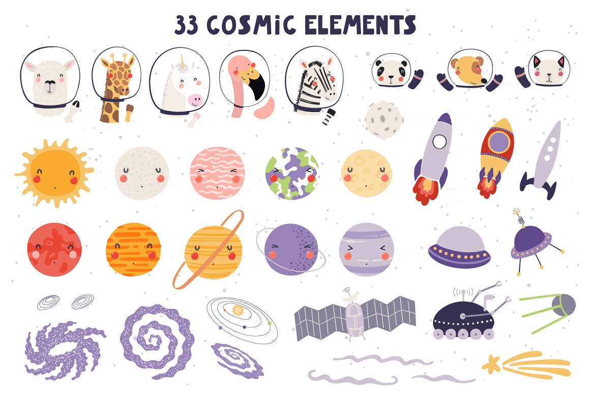 Let’s go on a space adventure! Inspired by Scandinavian design and Japanese kawaii aesthetic, this cute vector set includes 32 little animal astronauts and aliens and 33 cosmic elements – planets, spaceships, stars, galaxies, etc. Also included are hand drawn alphabet, 15 seamless patterns, some backgrounds, pre-made quotes and designs. 65 graphic elements.