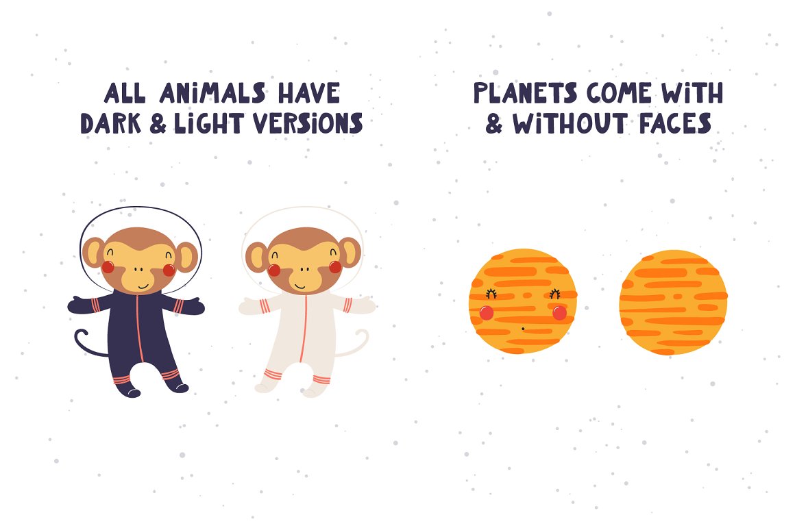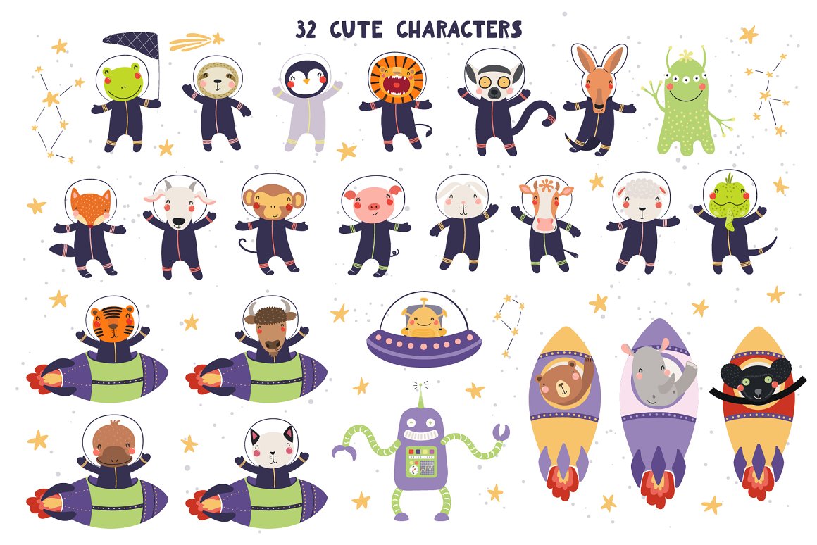 - 32 cute animal astronauts and aliens, light and dark version (AI, EPS10, separate high resolution PNG with transparent background)