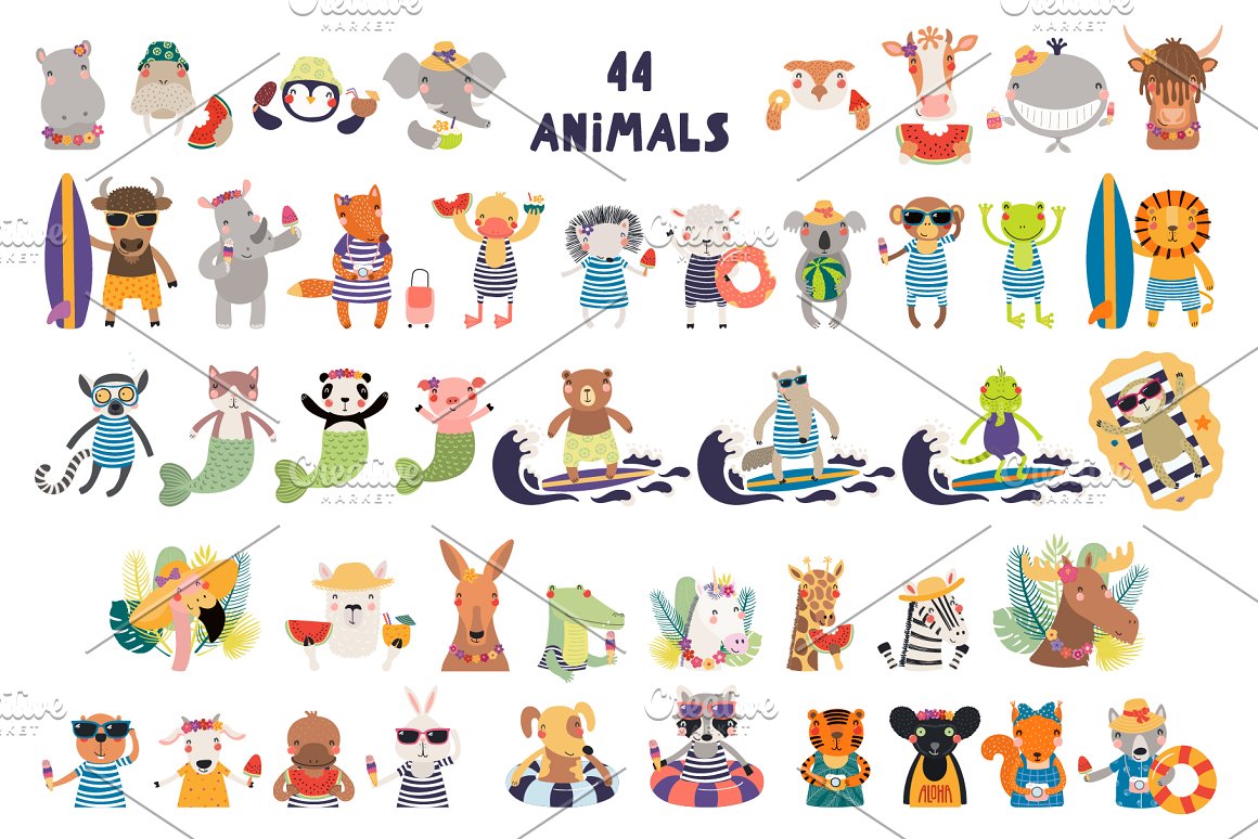 - 44 cute summer animals (AI, EPS10, separate high resolution PNG with transparent background)