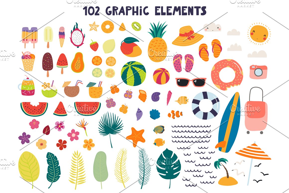 - 102 additional elements, including ice cream, drinks, tropical fruits, palm leaves, flowers, pool floats, seashells, coral reef fish, butterflies, etc. (AI, EPS10, separate high resolution PNG with transparent background)