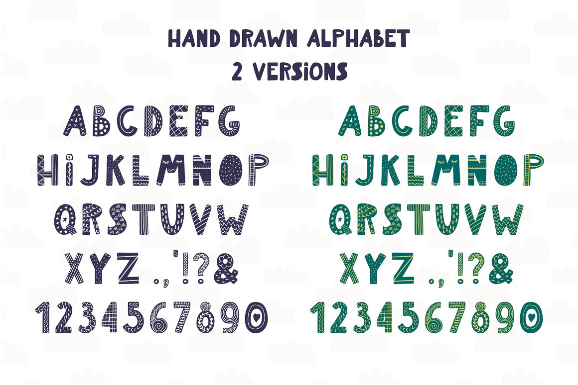- 1 hand drawn alphabet in 2 versions (blue and green) (AI, EPS10, separate high resolution PNG with transparent background)