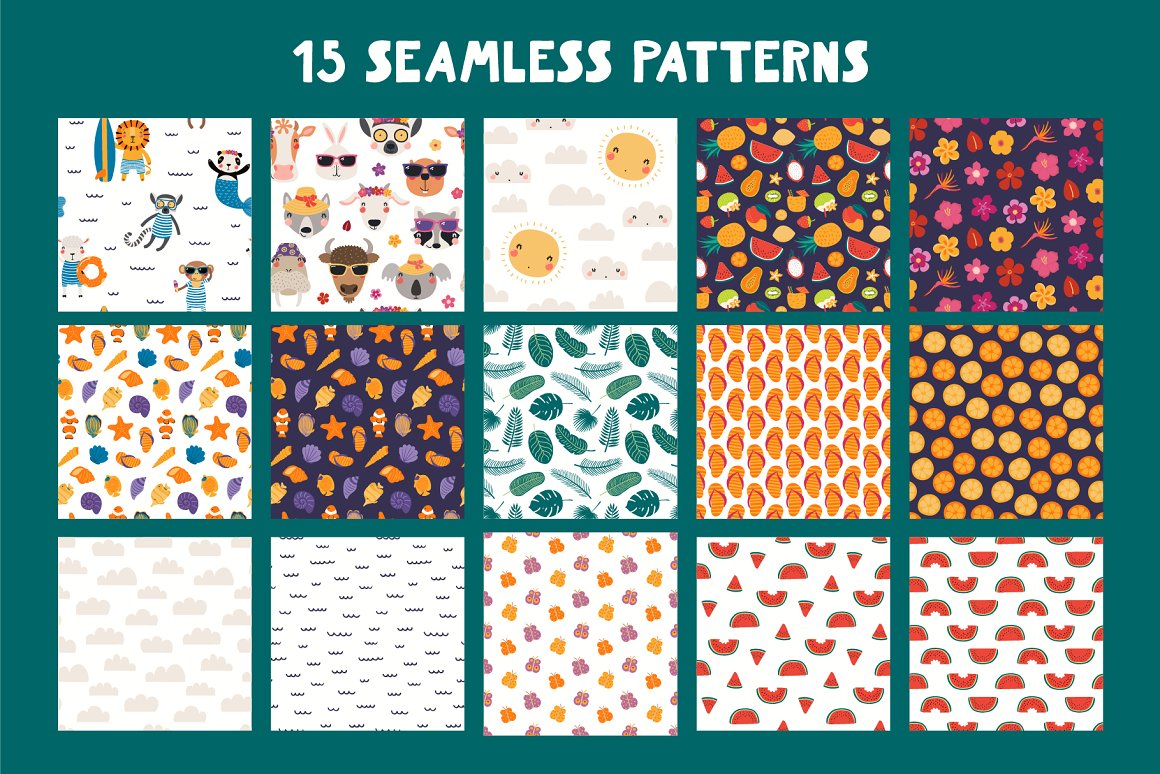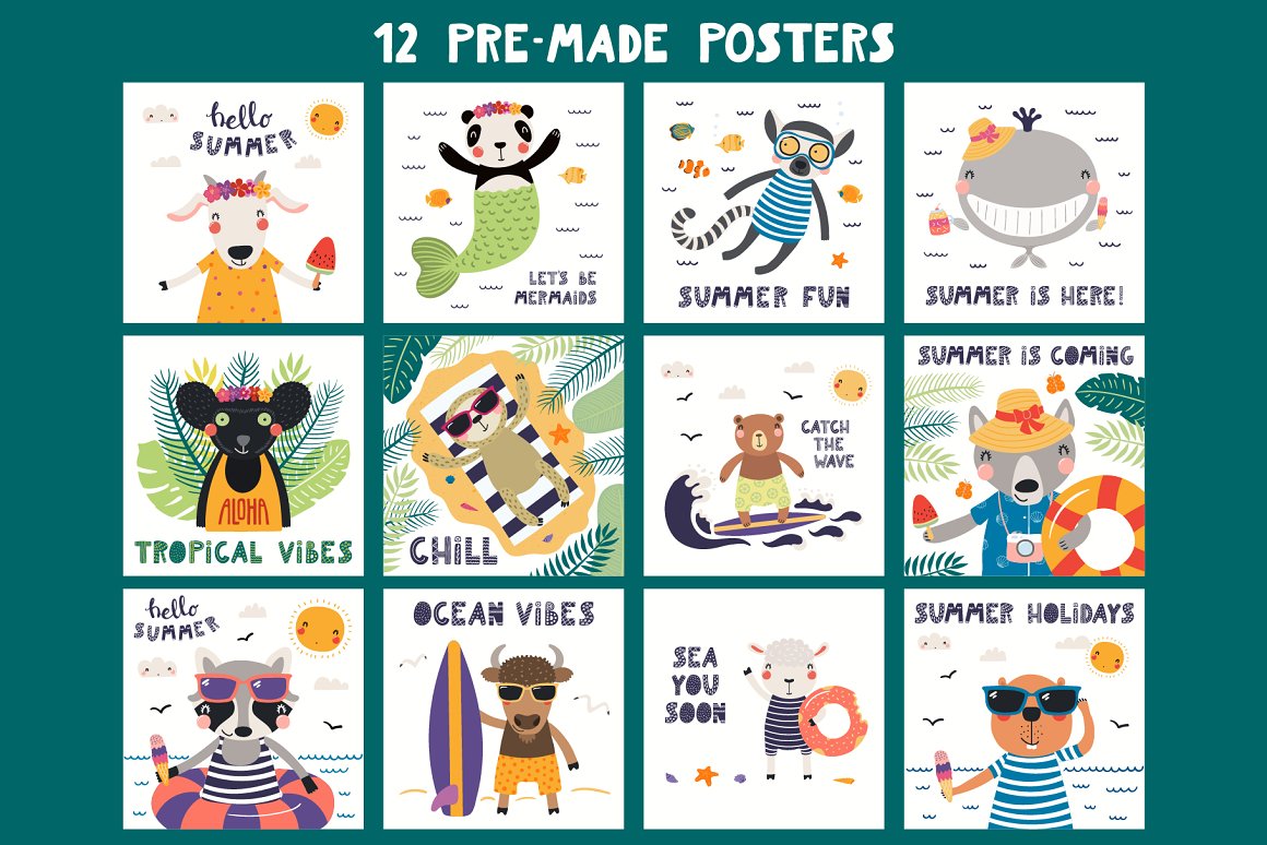 Hello Summer! Welcome everyone’s favorite season with my new collection of cute illustrations. Inspired by Scandinavian design and Japanese kawaii aesthetic, this vector set includes 44 cute little animals in summer and 102 clipart elements. Also included are hand drawn alphabet, lettering quotes, 15 seamless patterns and pre-made posters. 146 unique graphic elements in total.