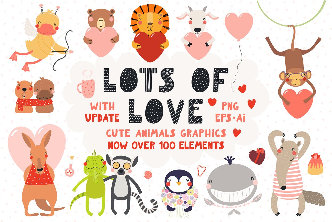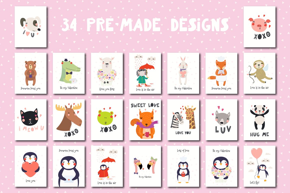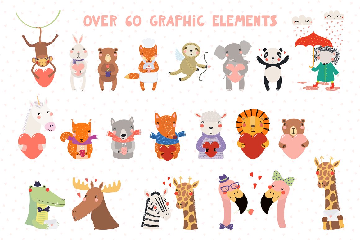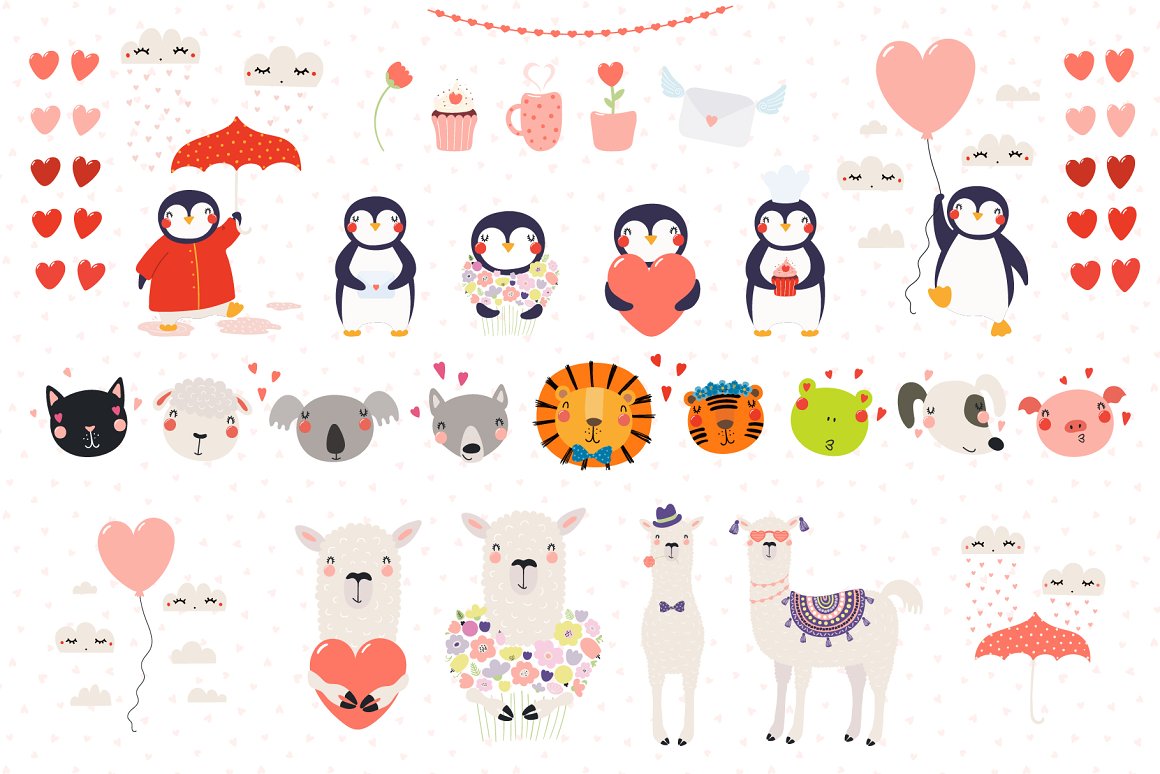 Valentine’s Day vector illustrations collection with cute animals. Includes lovely characters, clipart, hand drawn alphabet, holiday quotes, seamless patterns and pre-made designs – everything you need to make your love known. Inspired by Scandinavian design and Japanese kawaii aesthetic. Over 100 unique graphic elements total.