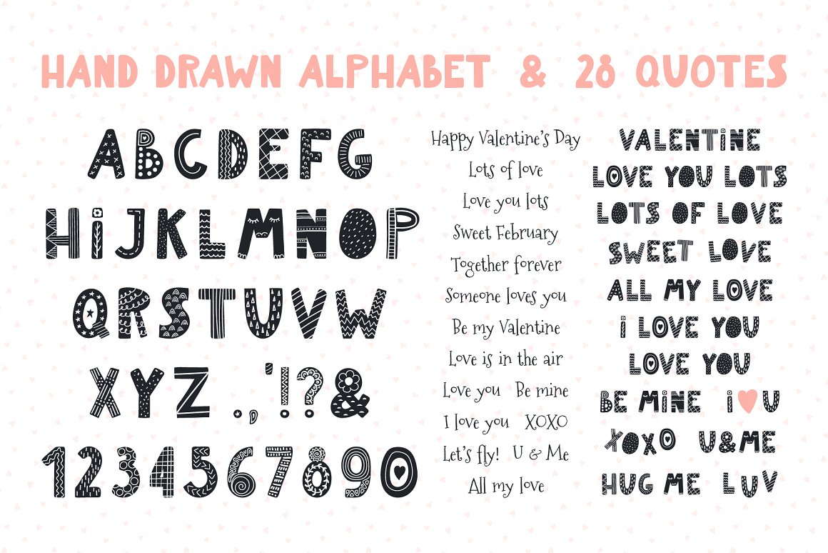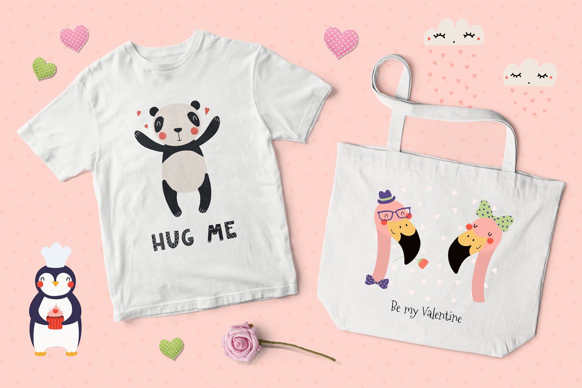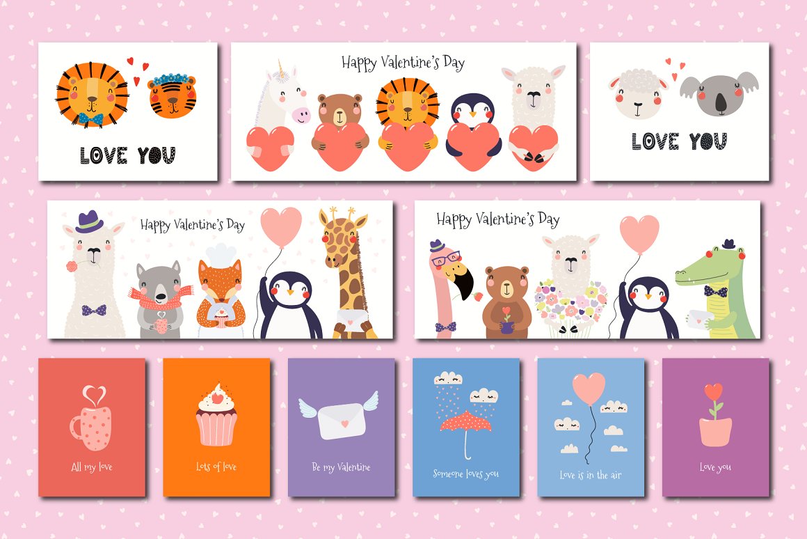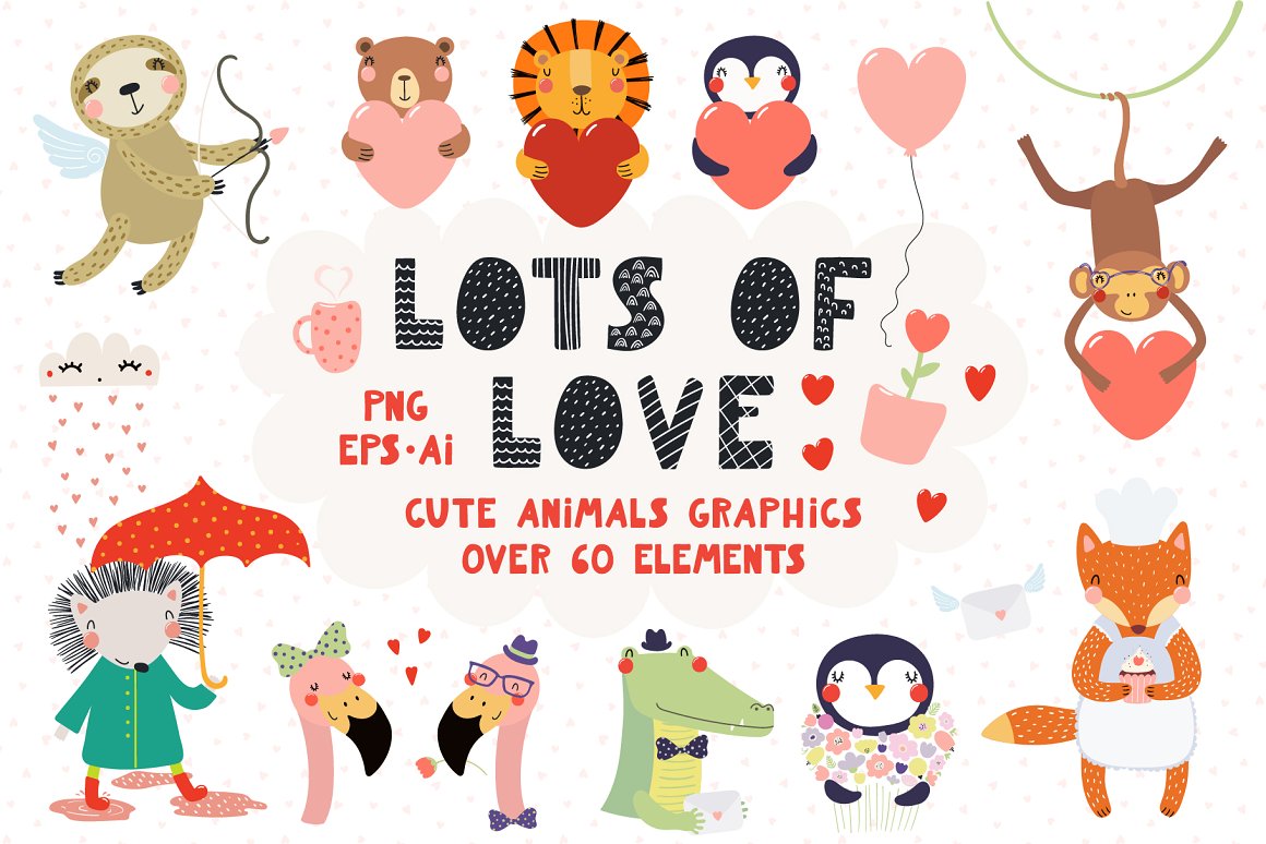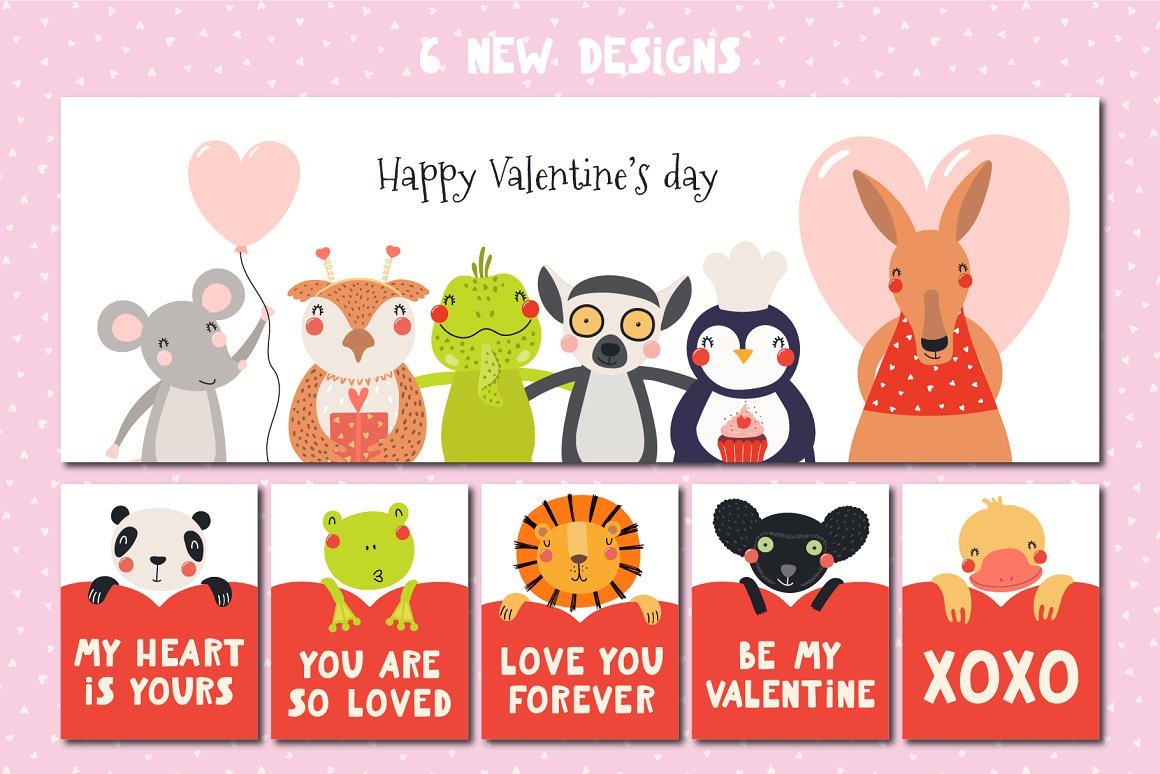 Valentine’s Day vector illustrations collection with cute animals. Includes lovely characters, clipart, hand drawn alphabet, holiday quotes, seamless patterns and pre-made designs – everything you need to make your love known. Inspired by Scandinavian design and Japanese kawaii aesthetic. Over 100 unique graphic elements total.