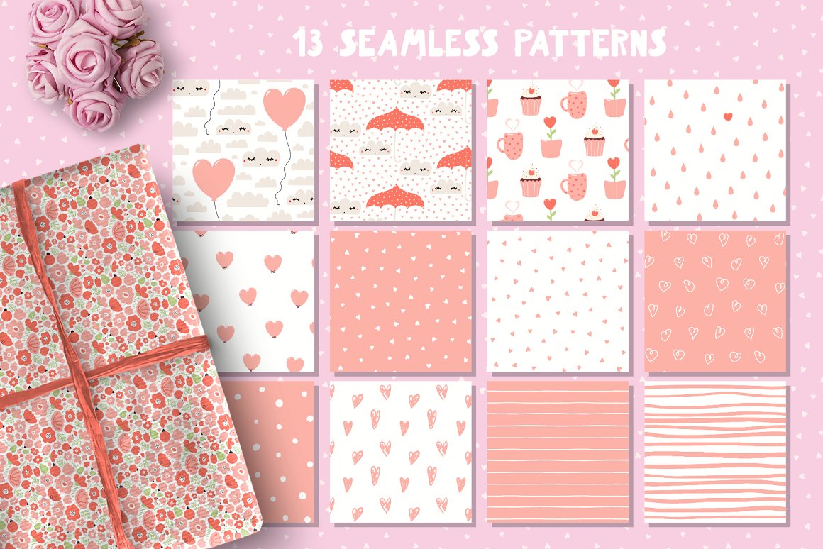 - 13 seamless patterns (AI, EPS10, high resolution PNG with transparent and color background)