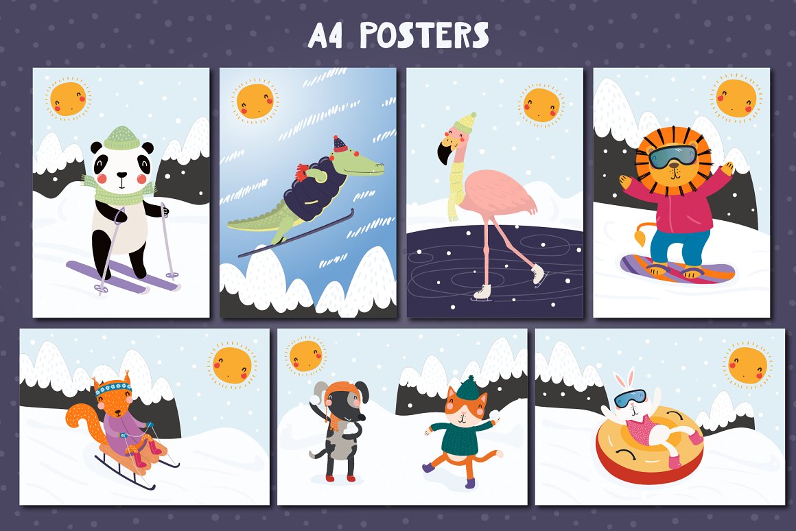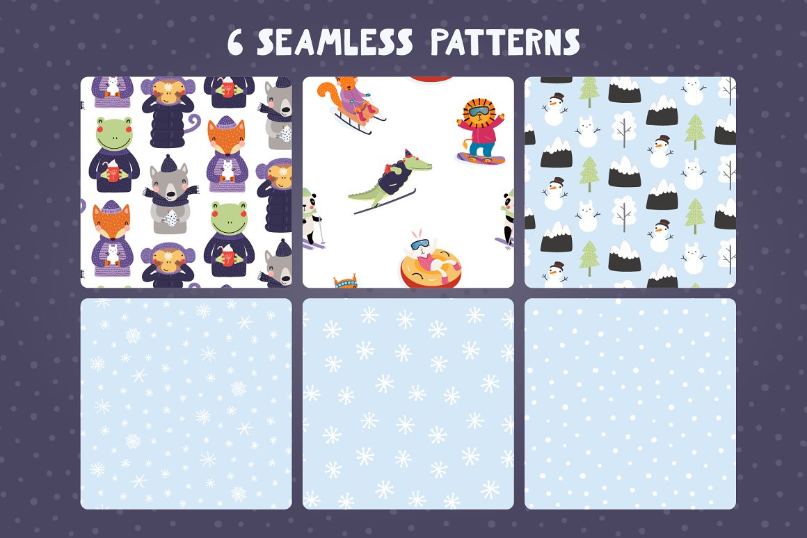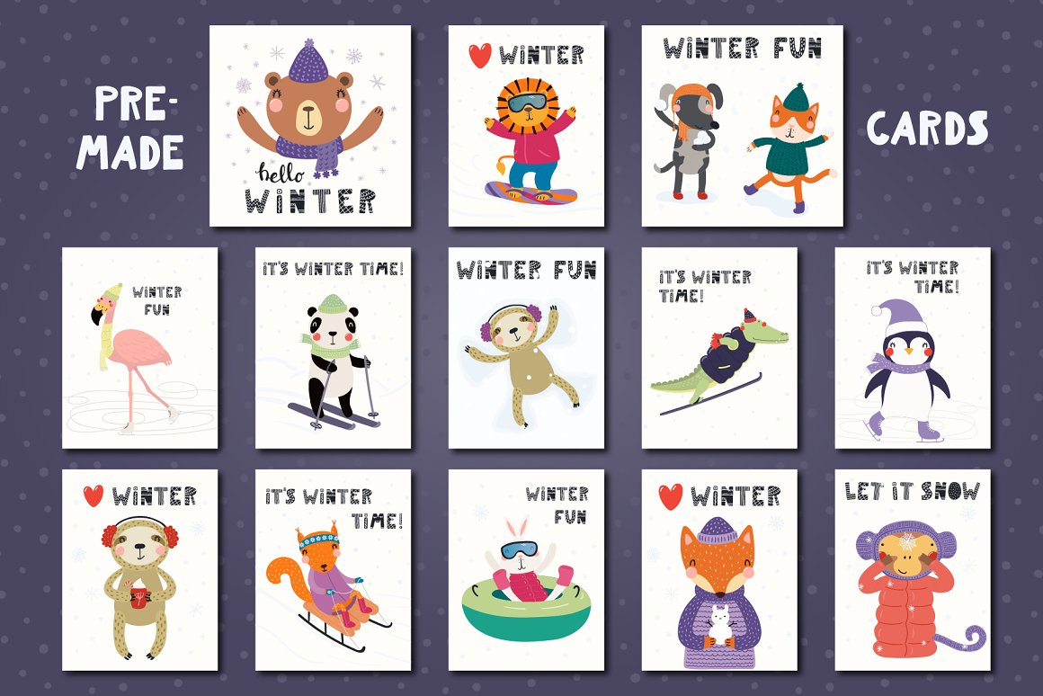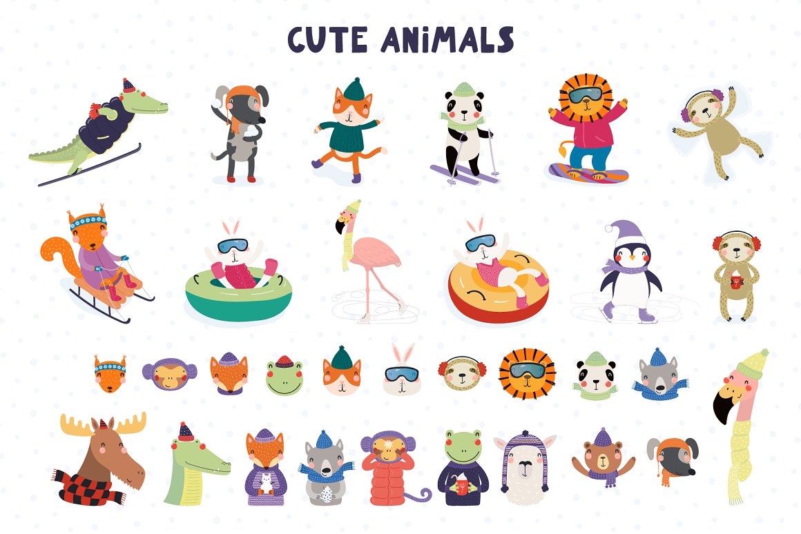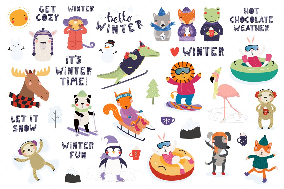 Vector illustrations with cute animals having winter fun playing in the snow, skiing, sledding, snowboarding, tubing, skating and, of course, there’s a snowball fight and making snow angels. Also included in this collection seasonal clipart and snowy backgrounds, hand drawn alphabet and some winter quotes, seamless patterns and pre-made designs. Inspired by Scandinavian design and Japanese kawaii aesthetic, and the upcoming winter.