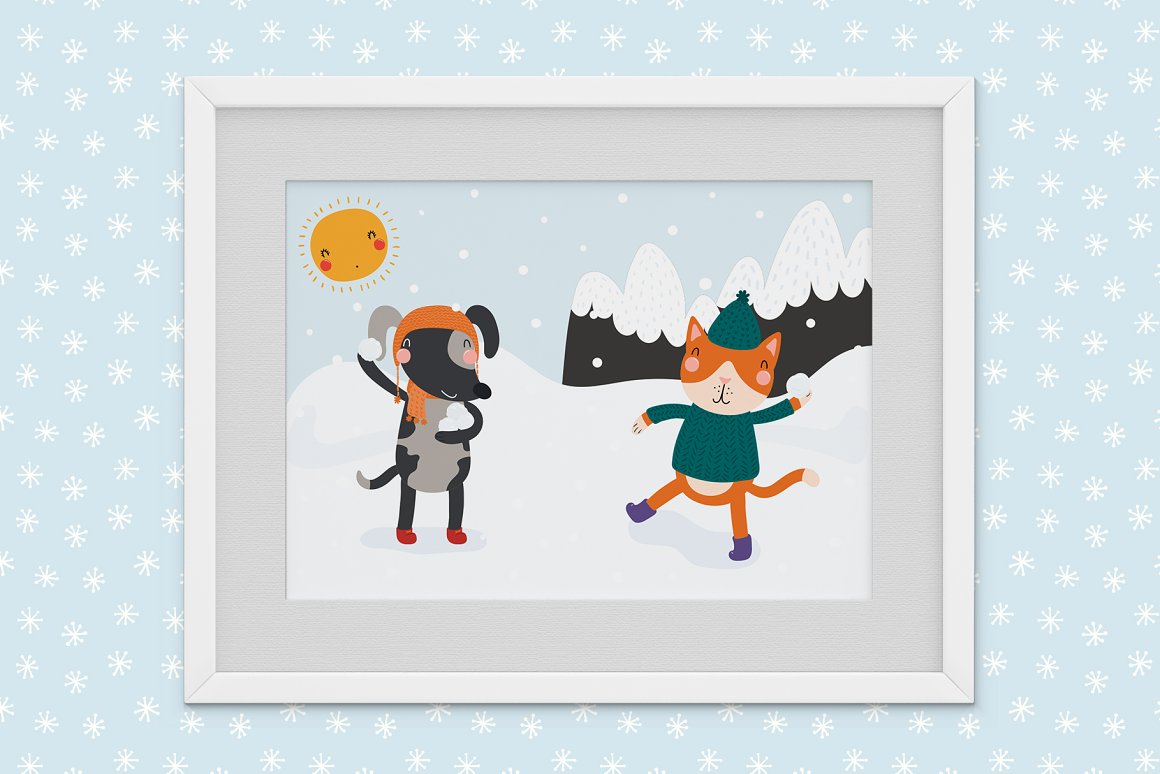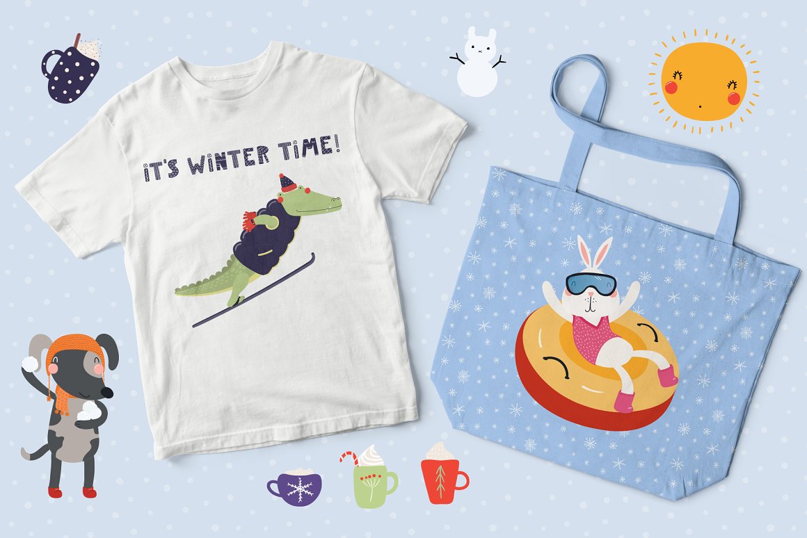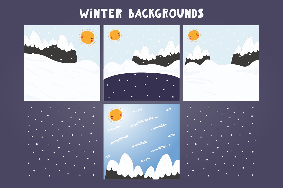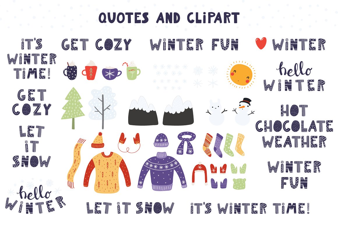 - 34 additional elements, including cute sun, trees, mountains, snowmen, warm clothes, mug cups, snowflakes (AI, EPS10, separate high resolution PNG with transparent background)