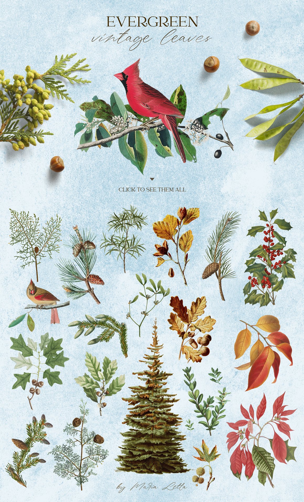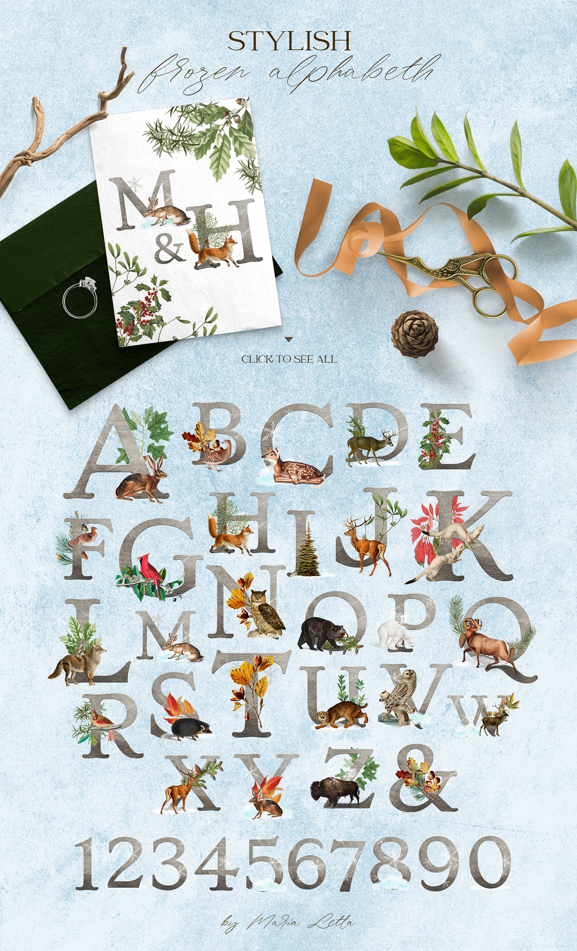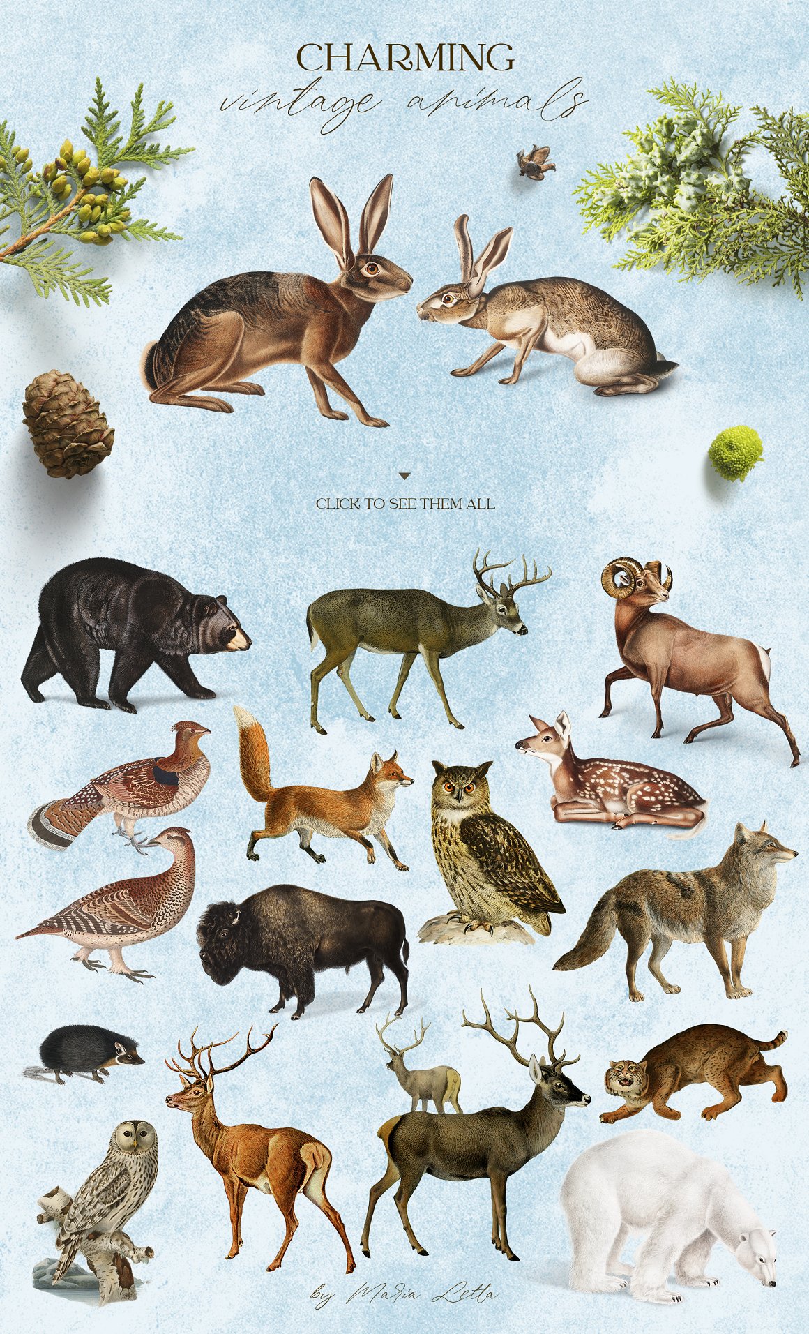 Elegant winter animals, beautiful branches and leaves, a frozen alphabet and unusual patterns all come together in this set to make your winter design special. Due to the fact that all elements have a transparent background, you can easily mix them with each other, even overlaying several patterns one on top of the other! Carefully selected illustrations from vintage books combine with modern watercolor elements in a stylish design.