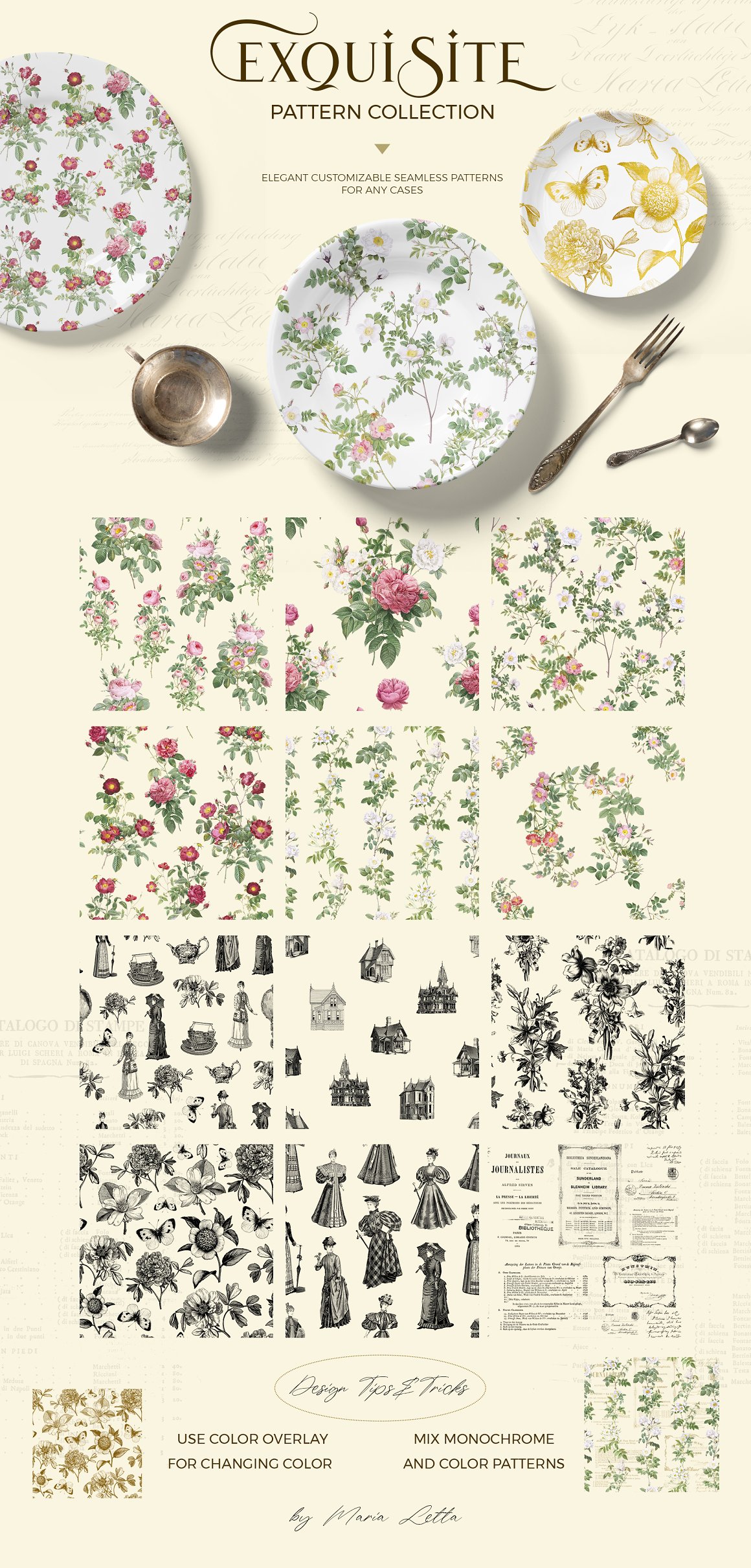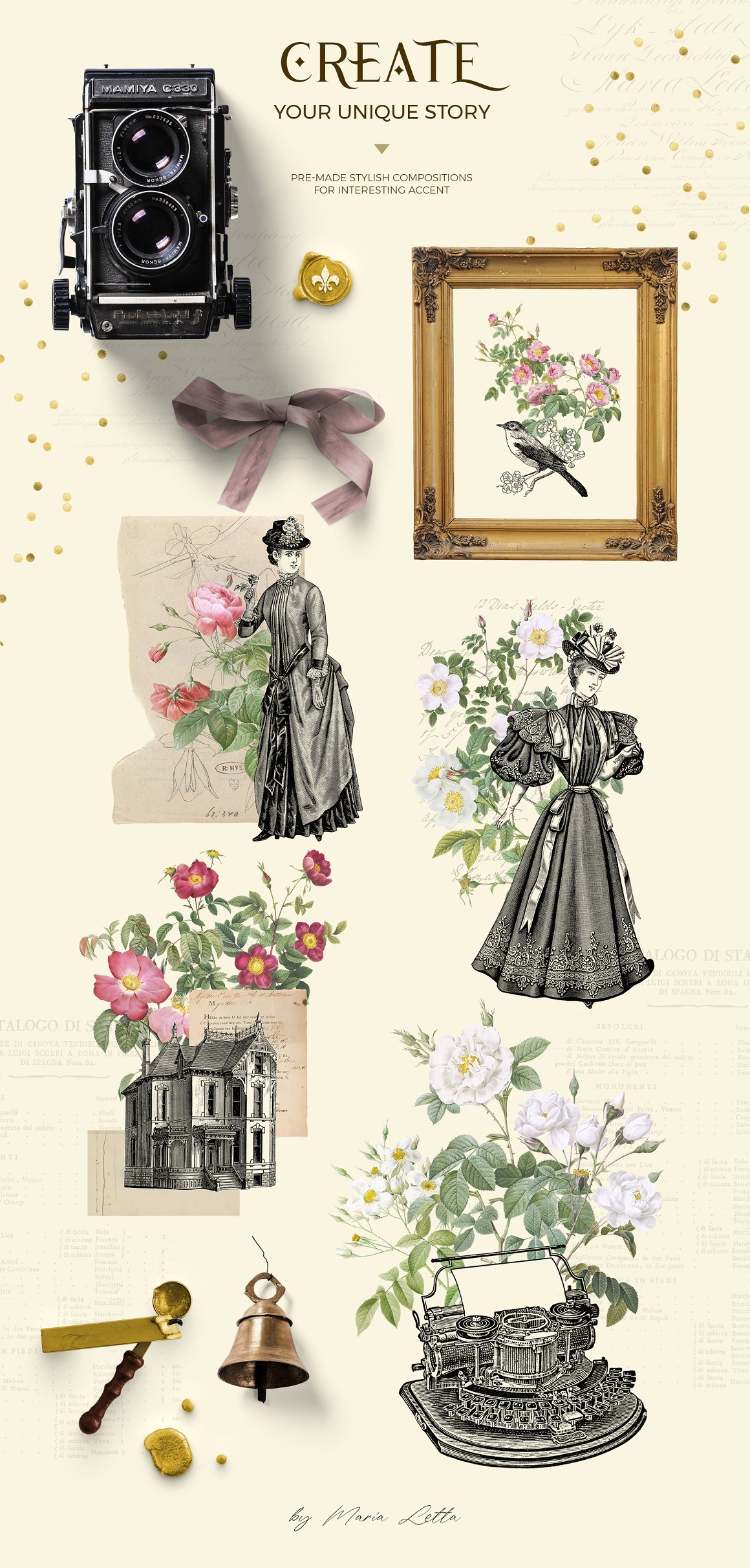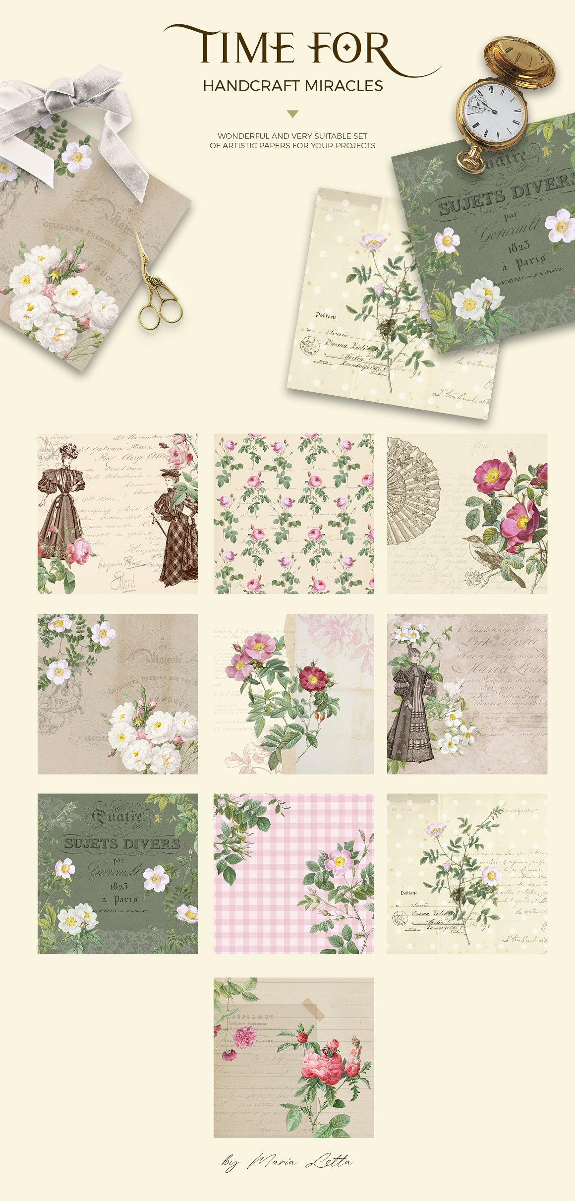 I’m so happy to introduce to my huge vintage collection. I’m absolutely fall in love with vintage and this design kit – very big work, but result very cool! You will find elegant vintage roses, amazing ephemera, authentic papers and stylish modern design elements like a patterns and compositions. If you love scrapbook, shabby chic and vintage – this collection “must have” for you.