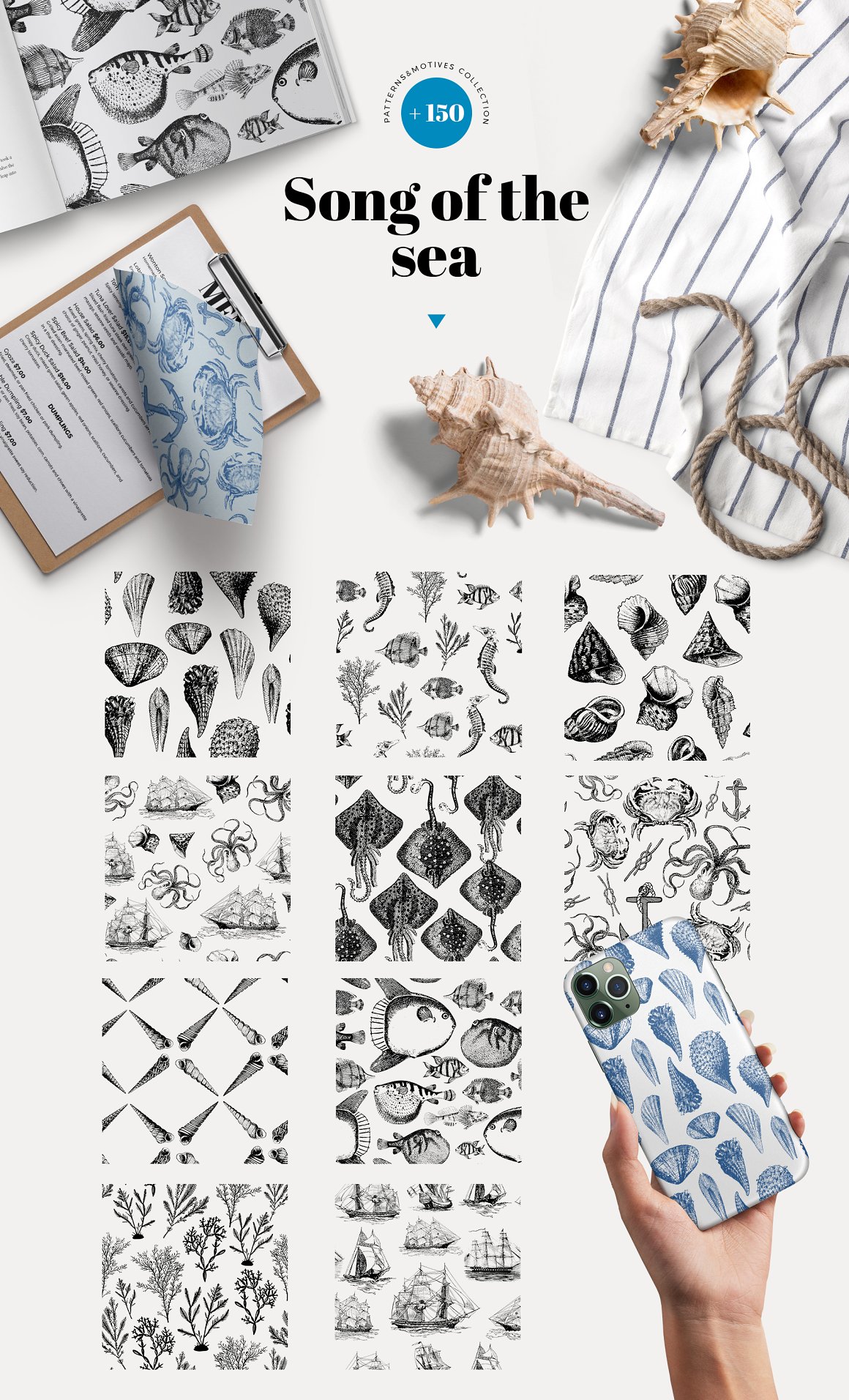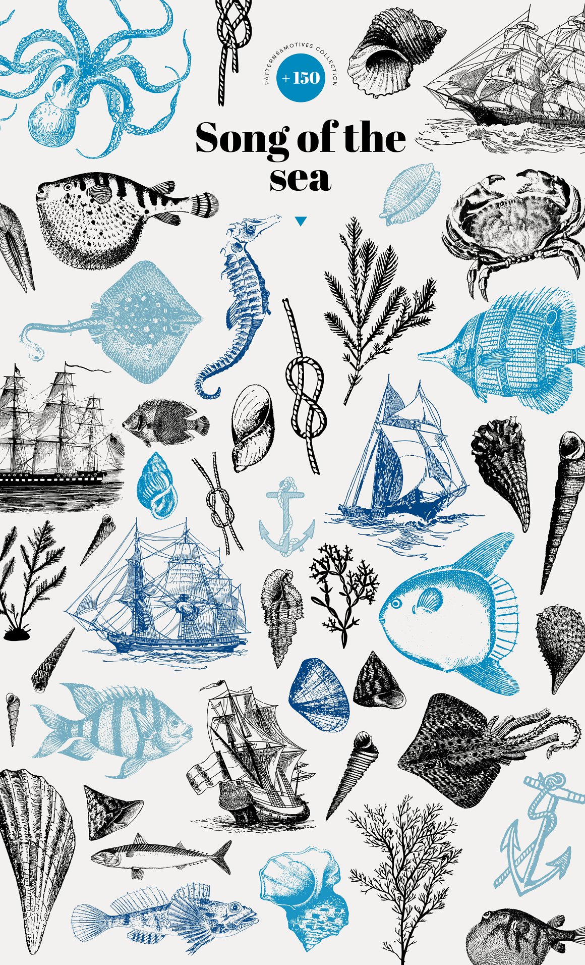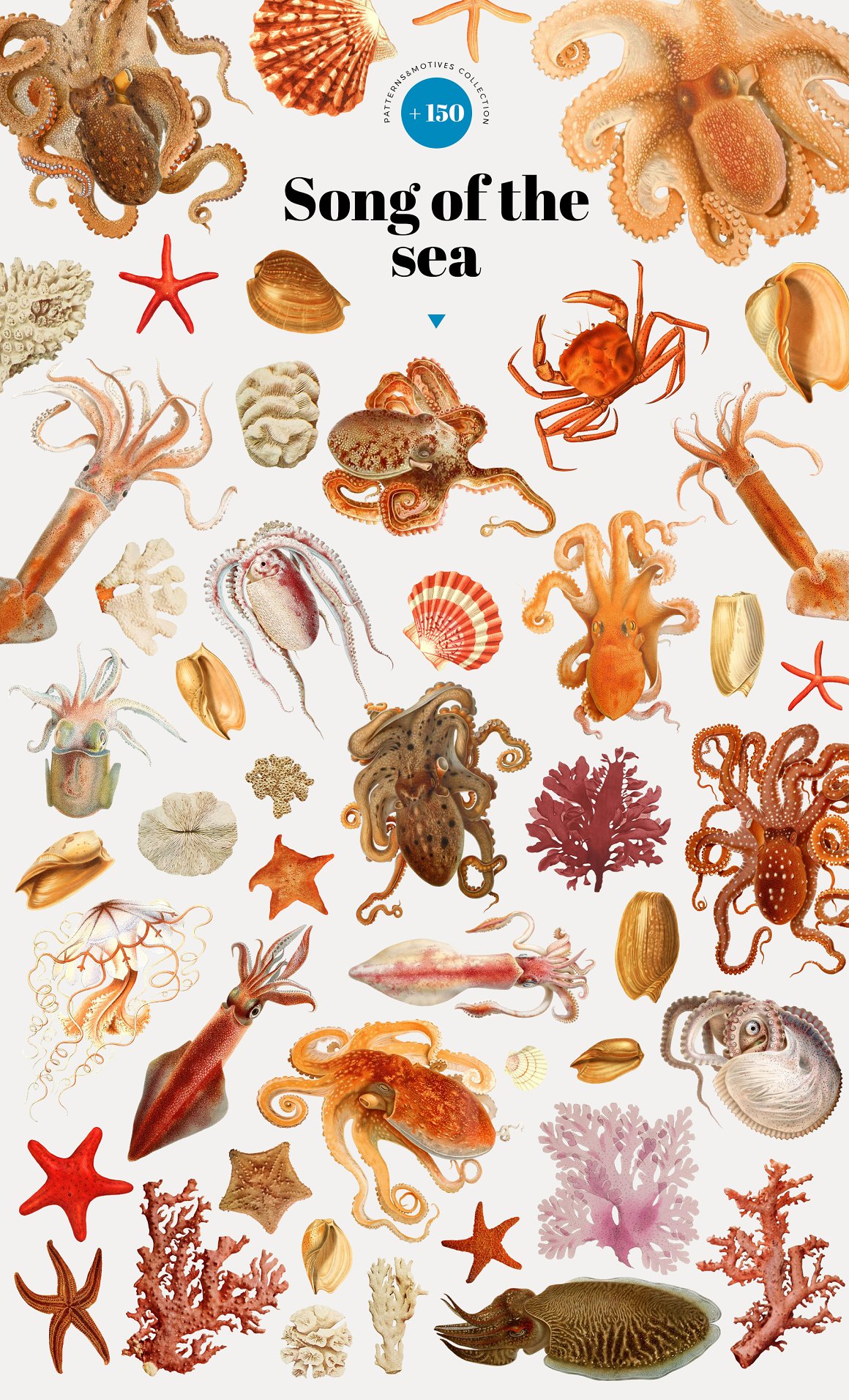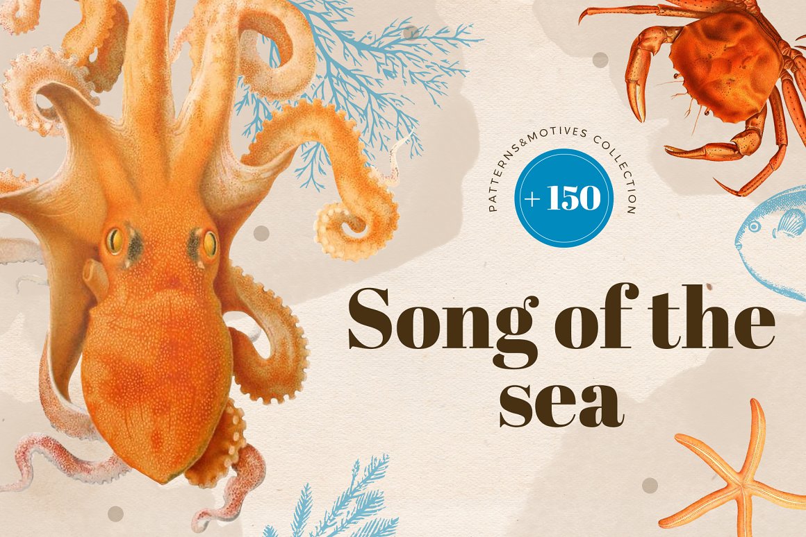 Luxurious vintage collection of patterns with marine inhabitants – squid, octopus, fish, shellfish, seahorses, seaweed and shells. Elegant and intricate, beautiful and stylish, eye-catching and exquisite detailed print suitable for variety of products from wallpapers to textiles and paper products.