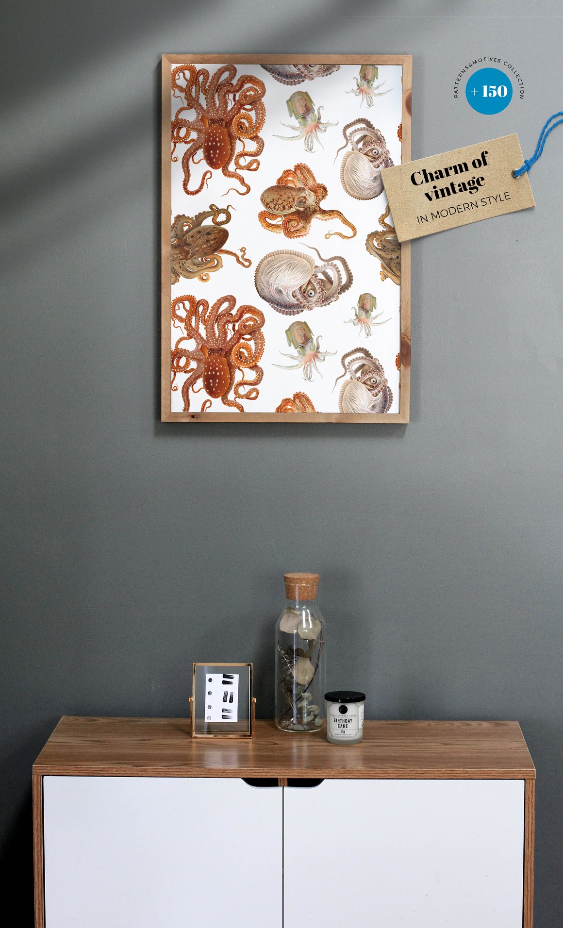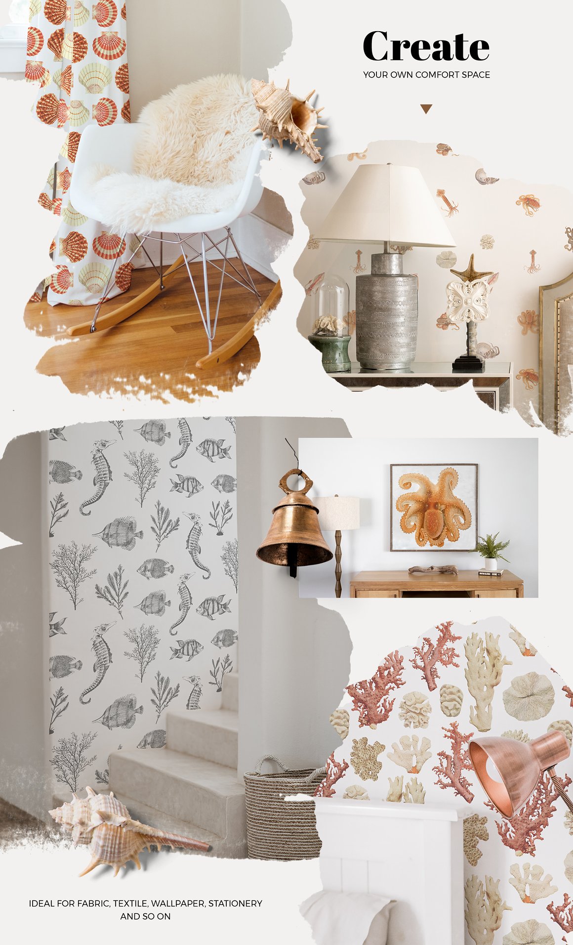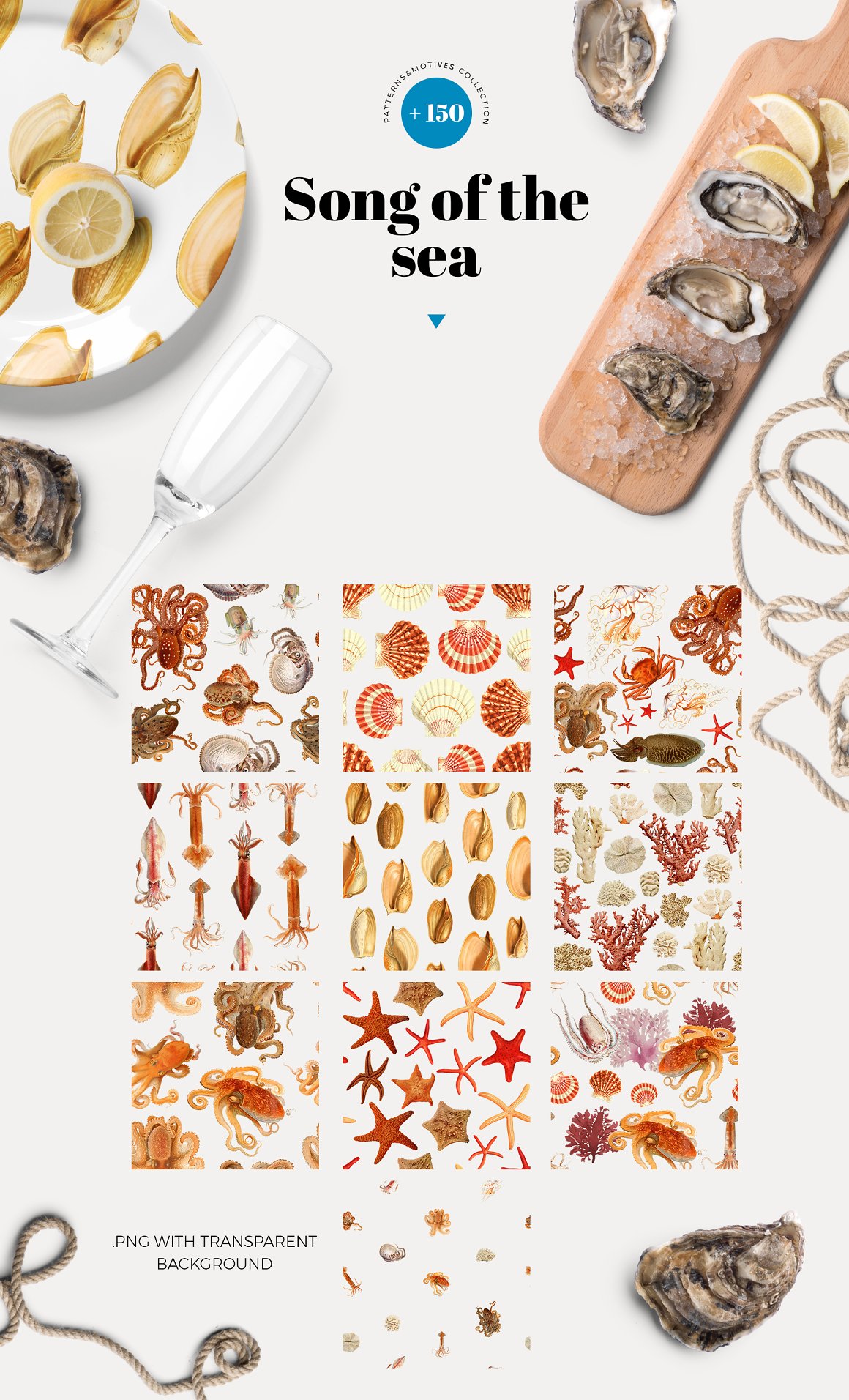Luxurious vintage collection of patterns with marine inhabitants – squid, octopus, fish, shellfish, seahorses, seaweed and shells. Elegant and intricate, beautiful and stylish, eye-catching and exquisite detailed print suitable for variety of products from wallpapers to textiles and paper products.