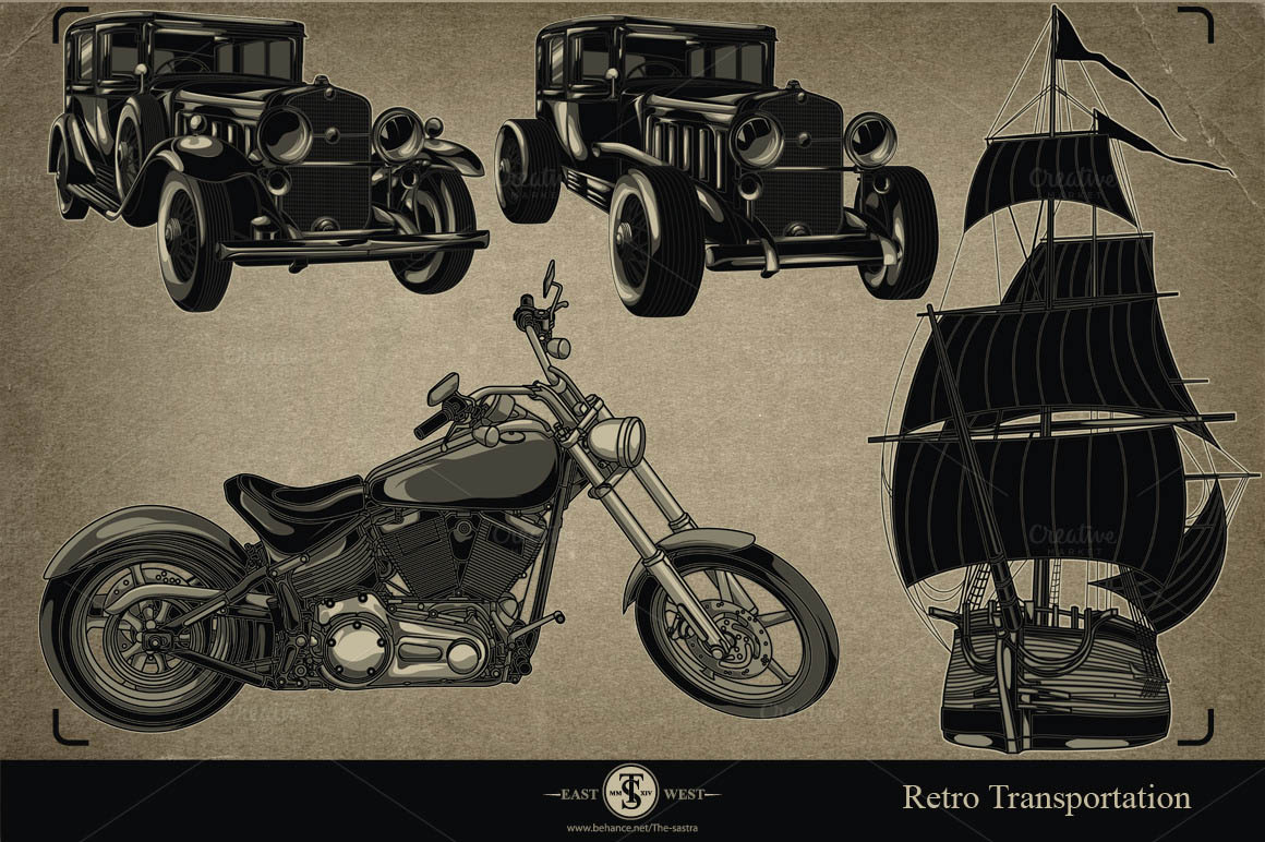This set of âRetro transportationâ are perfect for using on shirt design, poster and other creative applications. Includes these Vector files: 4.eps files, layered each colors and resizable. 4.ai files, layered each colors and resizable. 4.png files, with transparent background All file used CMYK color format on 300dpi.