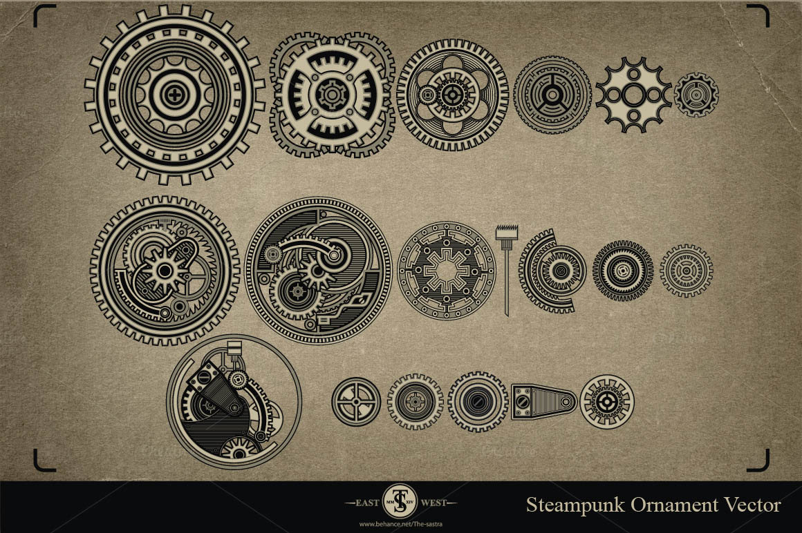 This set of âSteamPunk Ornamentâ are perfect for using on frame, badges and other creative applications. Includes these Vector files: 1.Ai files (20 object on 1 page), layered each colors and resizable 1.eps files (EPS10- 20 object on 1 page) , layered each colors and resizable 20.png files, with transparent background All file used CMYK color format on 300dpi.
