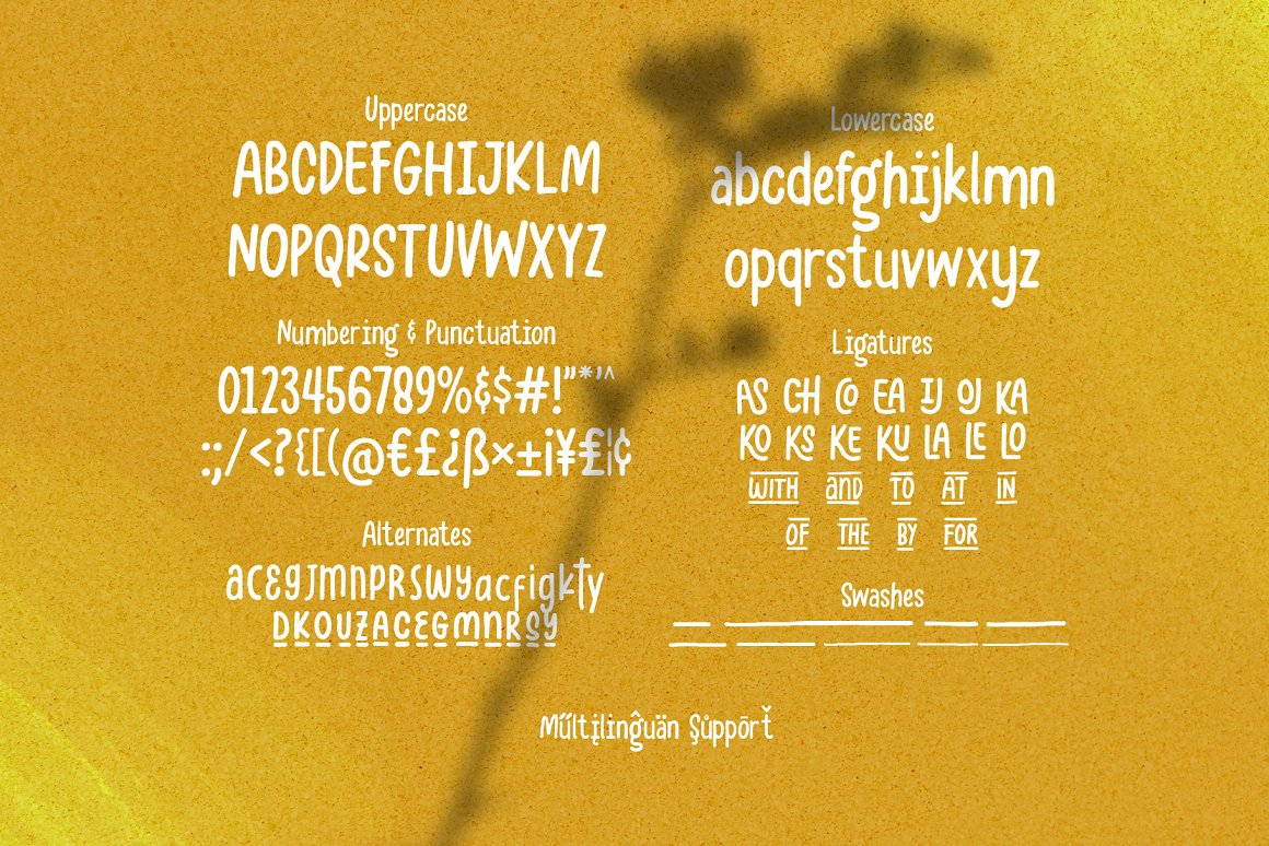 You can combine the uppercase and lowercase to get the more unique and cute design, equipped with stylistic alternates, ligatures, Sallomae is perfect for kids’ merchandise, quotes, t-shirts, posters, social media, pillow, packaging, storybook, food menu, cafe decoration, logos, and much more!