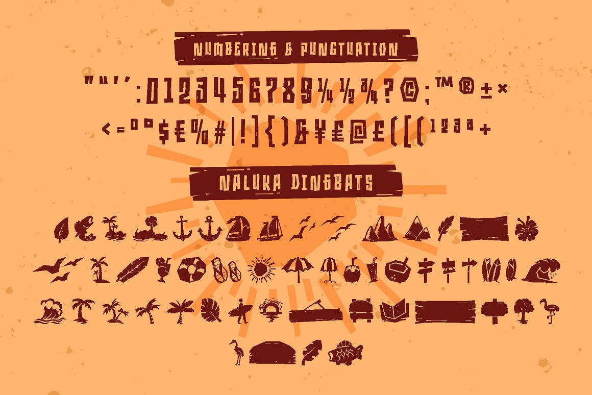 Naluka is created especially for specific themes such as summer, holiday, tropical, ethnic, cartoon, beach, cultural, children, and many more! This font is suitable for displays, packed with extra illustrations and OpenType features that you can combine to express your concept!