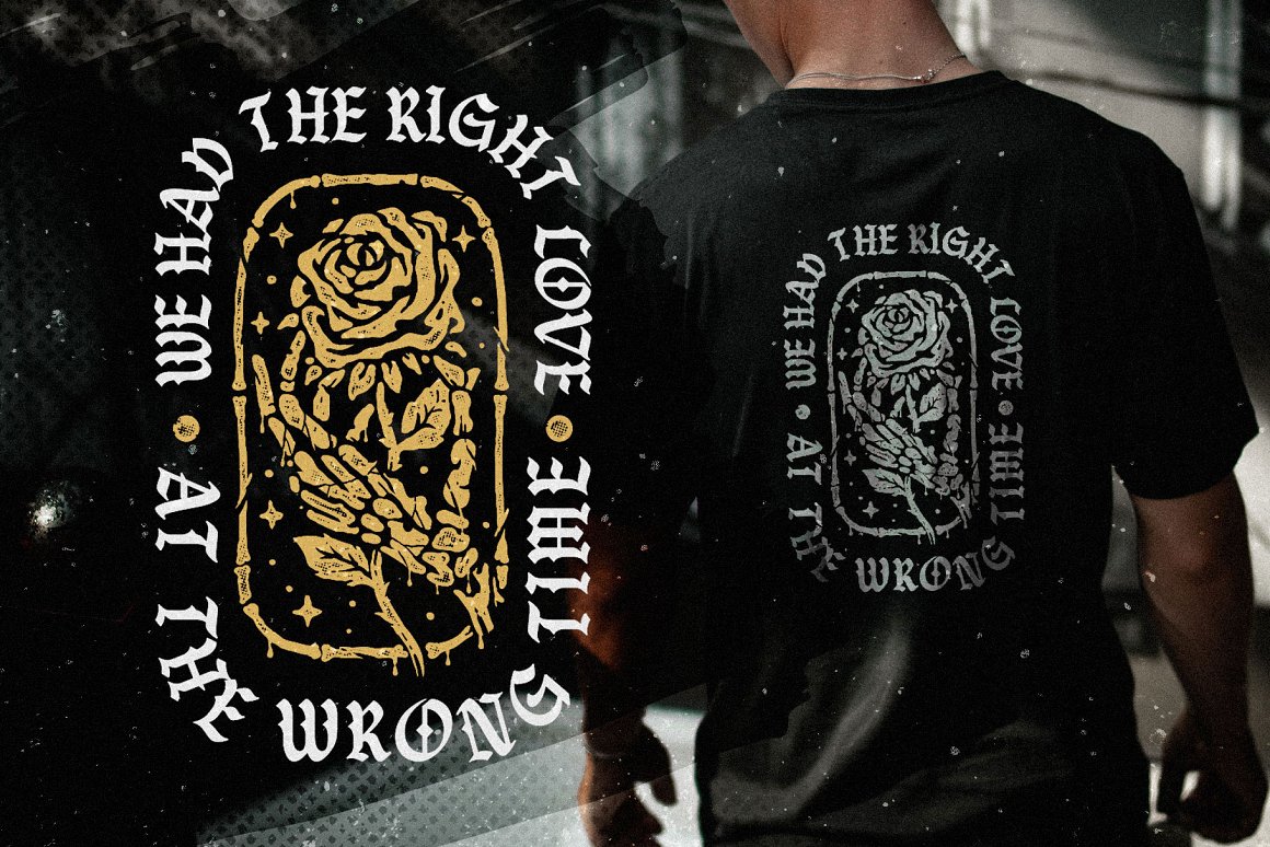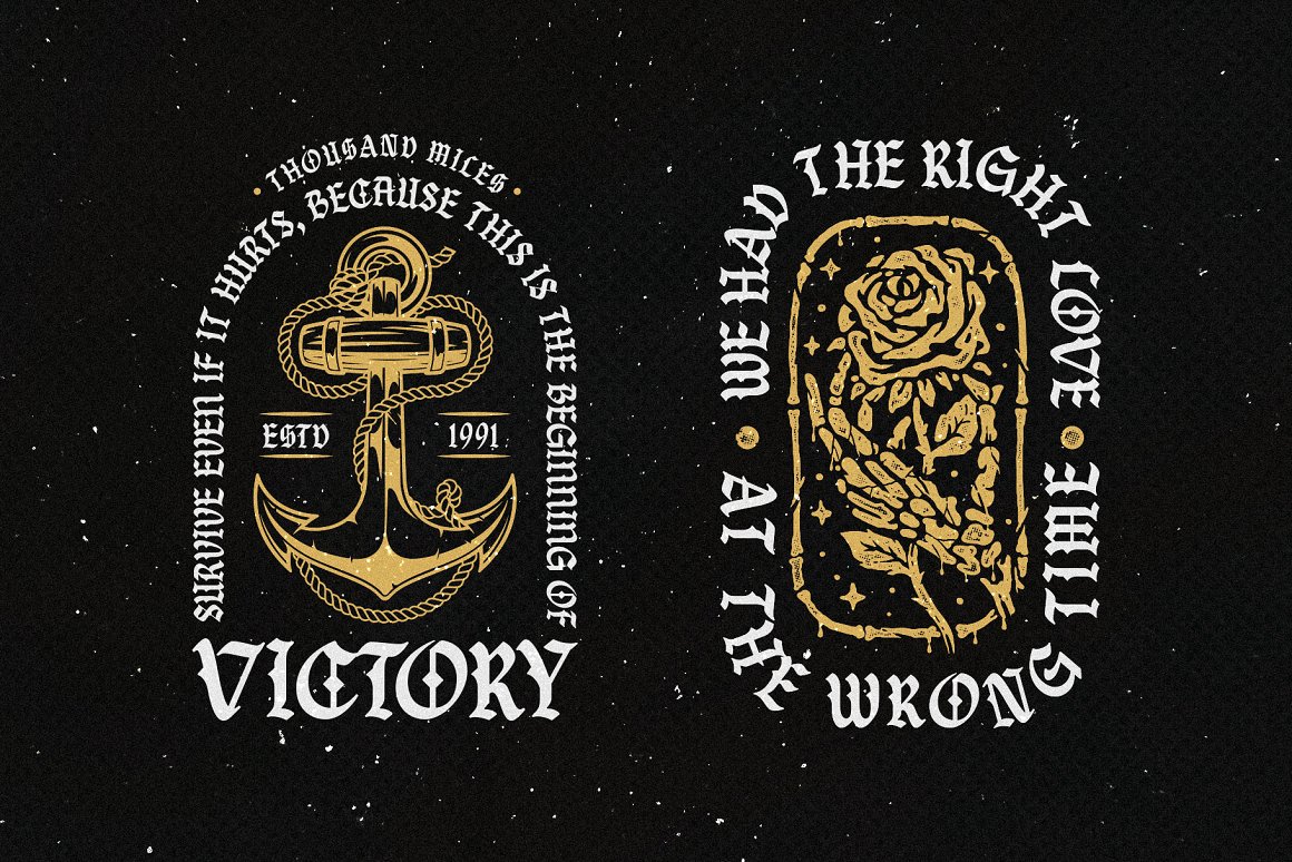 This font is combining several styles in blackletter fonts such as Bastarda, Rotunda, and Old English to produce an experimental font. Great for displays, especially dark and vintage themes. You can use this font on t-shirts, tote bags, stickers, labels, logos, badges, banners, quotes, and short text.