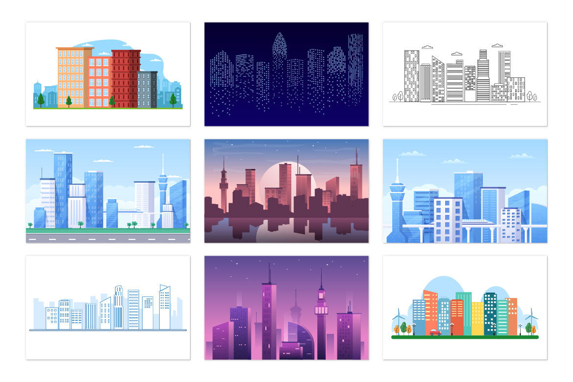Modern City Landscape Buildings and Architecture Real Estate Silhouette Vector Background Illustration in Line Simple Geometric Flat Style Template Features: