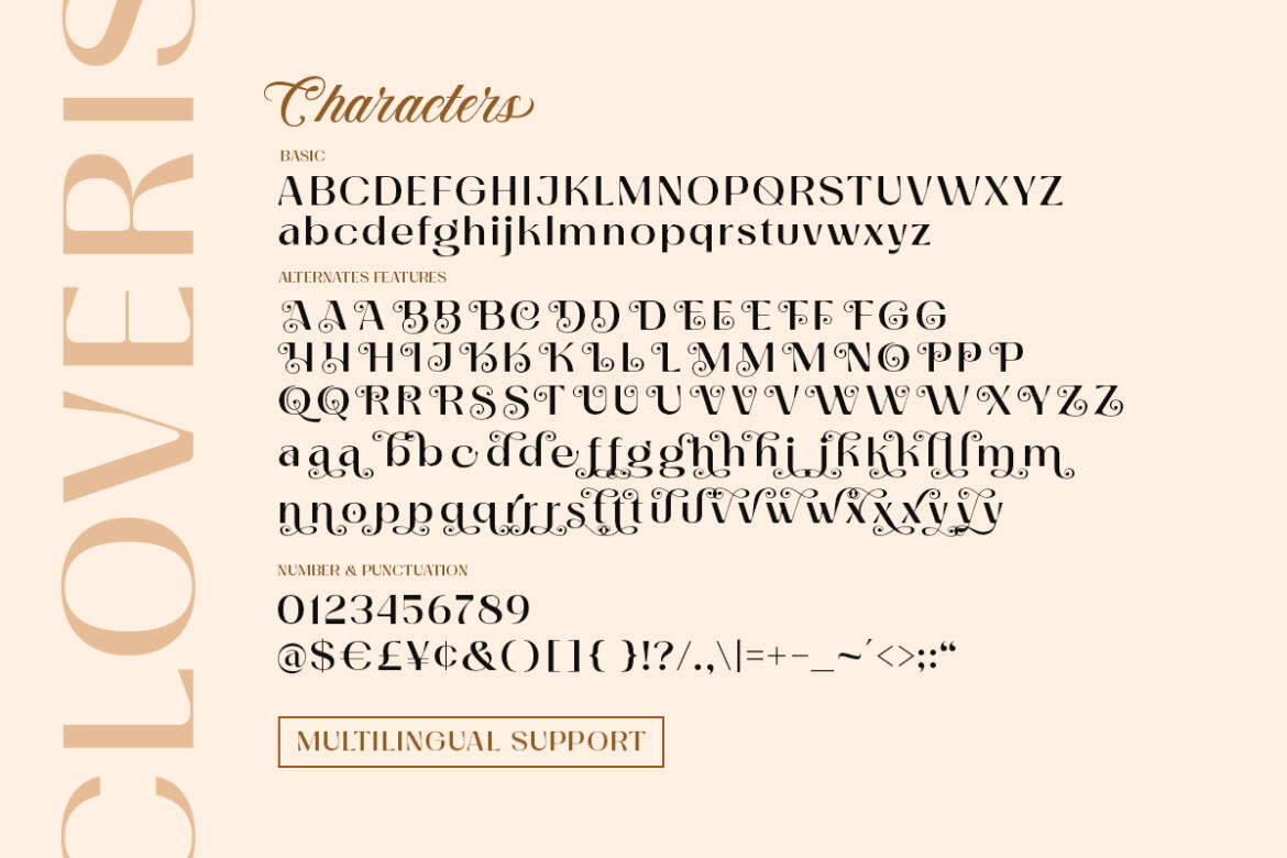 Cloveris is a sophisticated sans serif with unique swirls and swashes. The letterform makes this typeface unique and stands out rather than the regular sans serif font. Very suitable for logo, headline, tittle, and the other various formal forms such as invitations, labels, logos, magazines, books, greeting / wedding cards, packaging, fashion, make up, stationery, novels, labels or any type of advertising purpose. We highly recommend using a program that supports OpenType features and Glyphs panels like many of Adobe apps and Corel Draw, so you can see and access all Glyph variations. How to access opentype feature : letterhend.com/tutorials/using-opentype-feature-in-any-software/