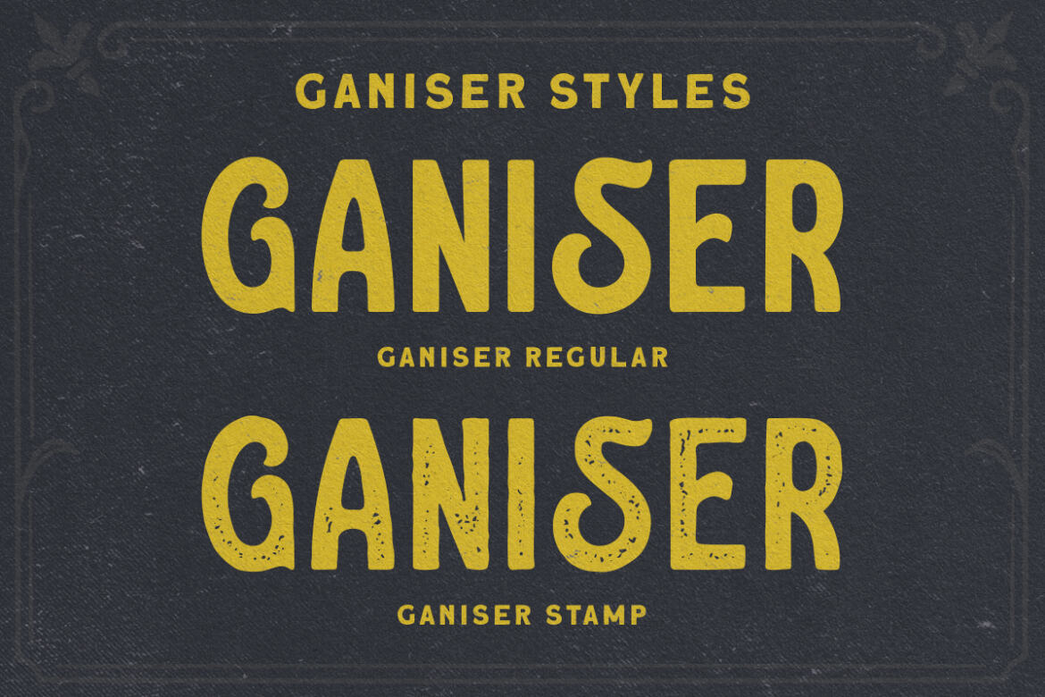 Ganiser Sans is a vintage display typeface with the touch of nostalgic feel. This typeface has unique looks and strong character with extra premade logo as bonus. This font perfectly made to be applied especially in logo, and the other various formal forms such as invitations, labels, magazines, books, greeting / wedding cards, packaging, fashion, make up, stationery, novels, labels or any type of advertising purpose. We highly recommend using a program that supports OpenType features and Glyphs panels like many of Adobe apps and Corel Draw, so you can see and access all Glyph variations.