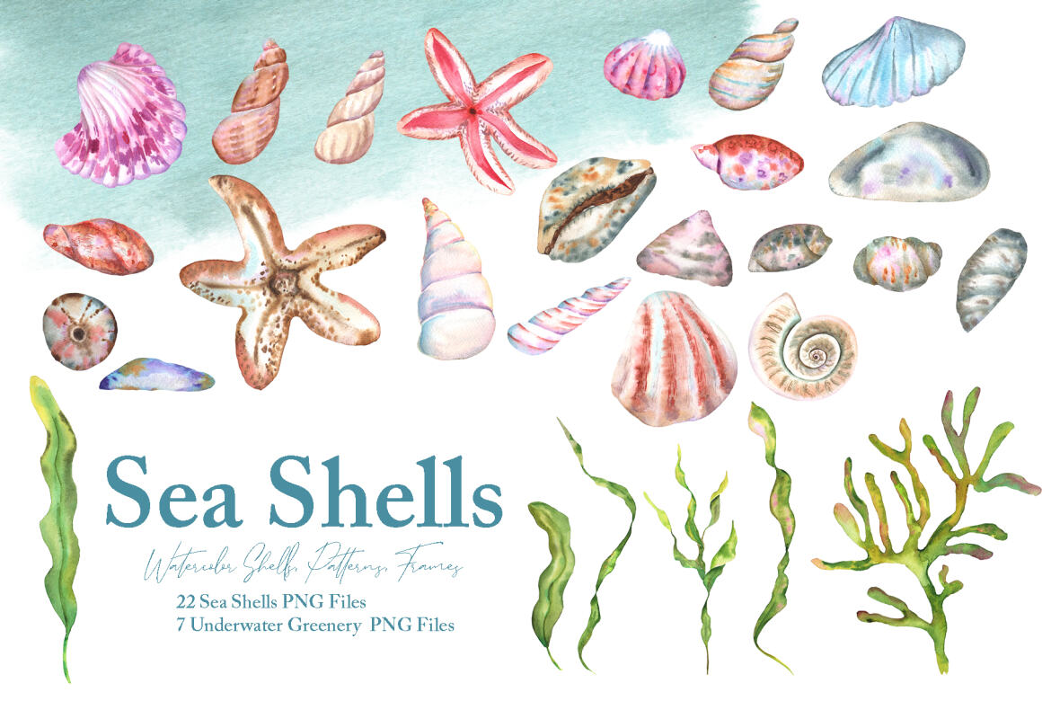 22 Seperate Sea Shells Elements in Watercolor PNG Files.