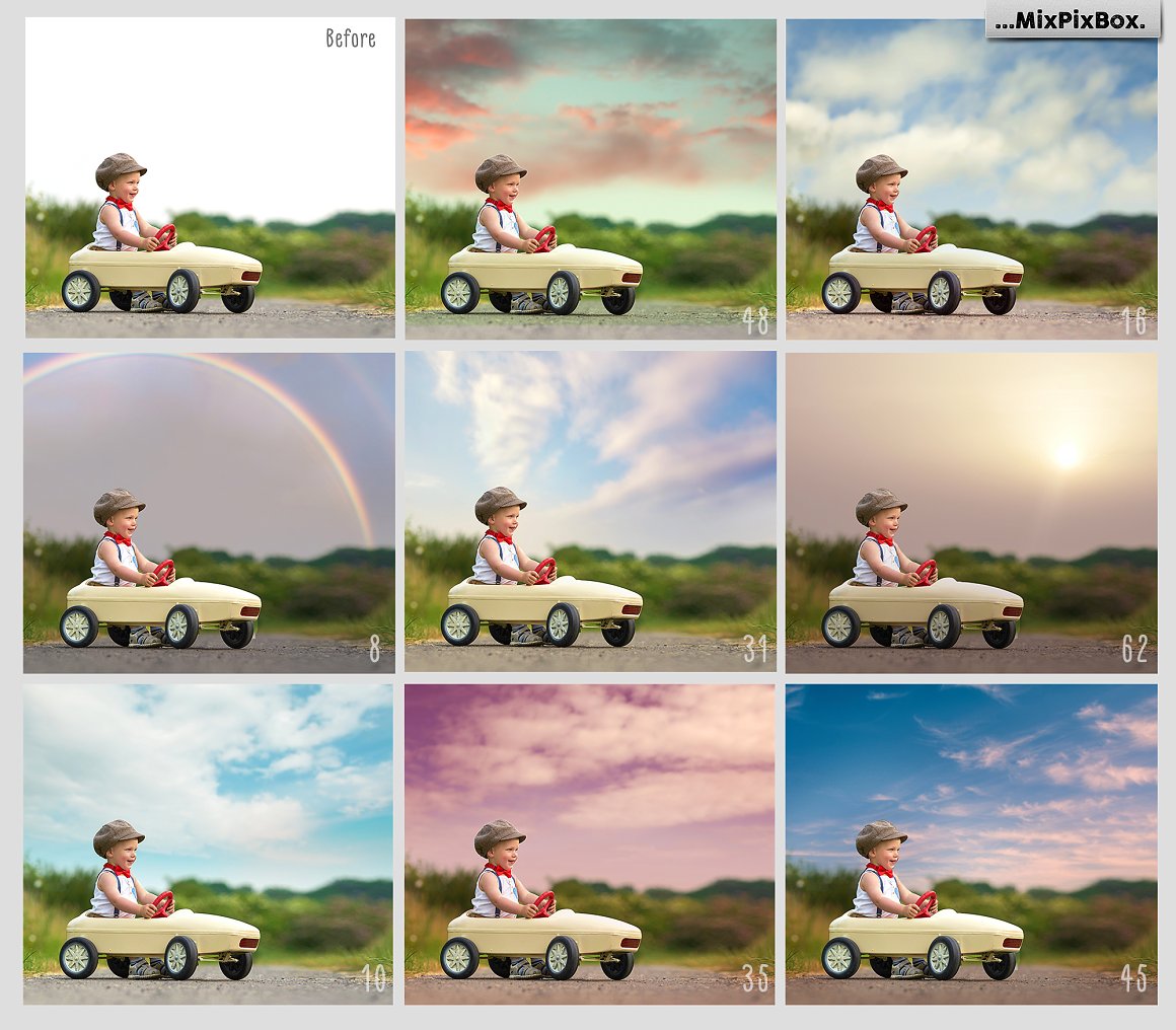 As the name suggests, you get 60 high-resolution and photo-realistic romantic sky overlays with clouds of different shapes and hues. Pictures say more than thousand words – look at our before-and-after pictures to get an impression of the way this amazing sky pack can transfigure the mood and conception of the photo.