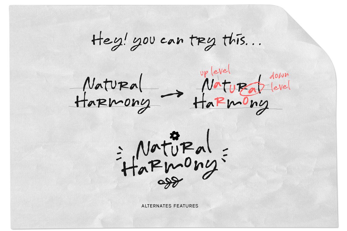 Do you want your visuals to be louder? Hurtmore typeface can make your visuals more powerful. A fun handwritten design with a realistic scribble style. It can add a sense of loudness and boldness to your visuals. Hurtmore also features a unique stylistic alternating character. You can mix and match it however you like!
