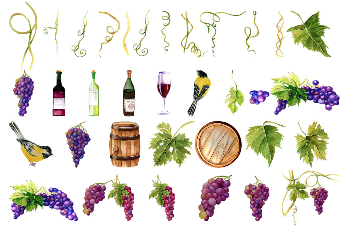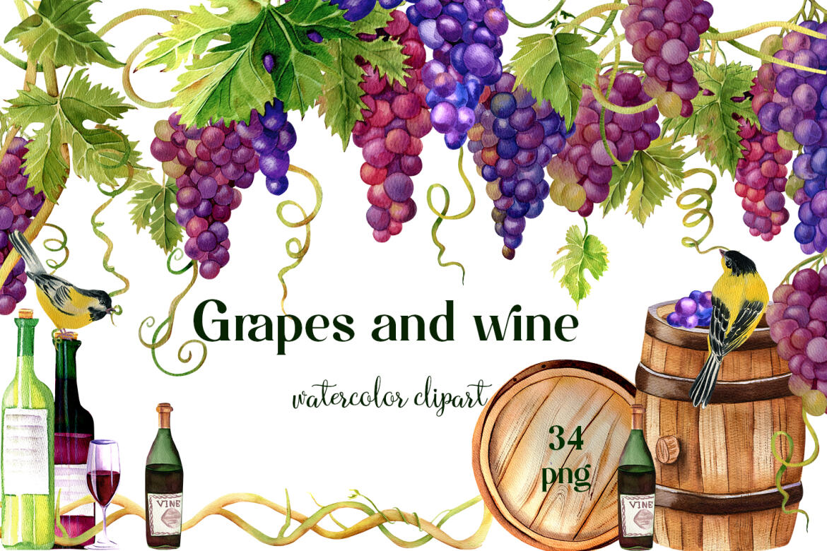 57. Grapes and wine watercolor clipart from Elena Zlatomrezova