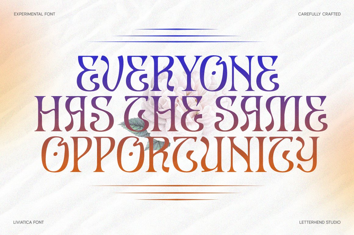 Liviatica is a sophisticated serif with unique letterform. This typeface has been made carefully to make sure its premium quality and luxury feel. The letterform makes this typeface unique and stands out rather than the regular serif font. Very suitable for logo, headline, tittle, and the other various formal forms such as invitations, labels, logos, magazines, books, greeting / wedding cards, packaging, fashion, make up, stationery, novels, labels or any type of advertising purpose.