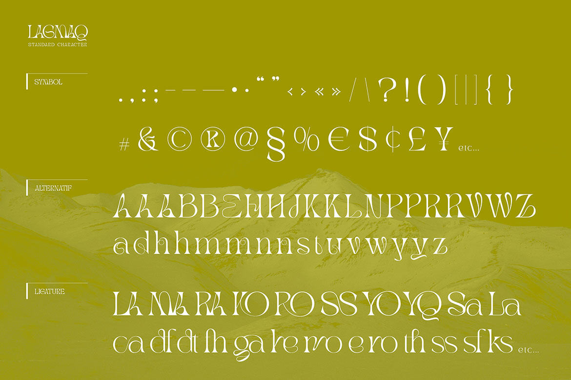 Trendy, elegant, artistic & modern style serif font for your fancy projects. Elegant, fashion and crazy style on Lagmaq font will be great for any branding project. Lot of alternates and ligatures will help you to create unique and original logo design or website header! Enjoy 🙂