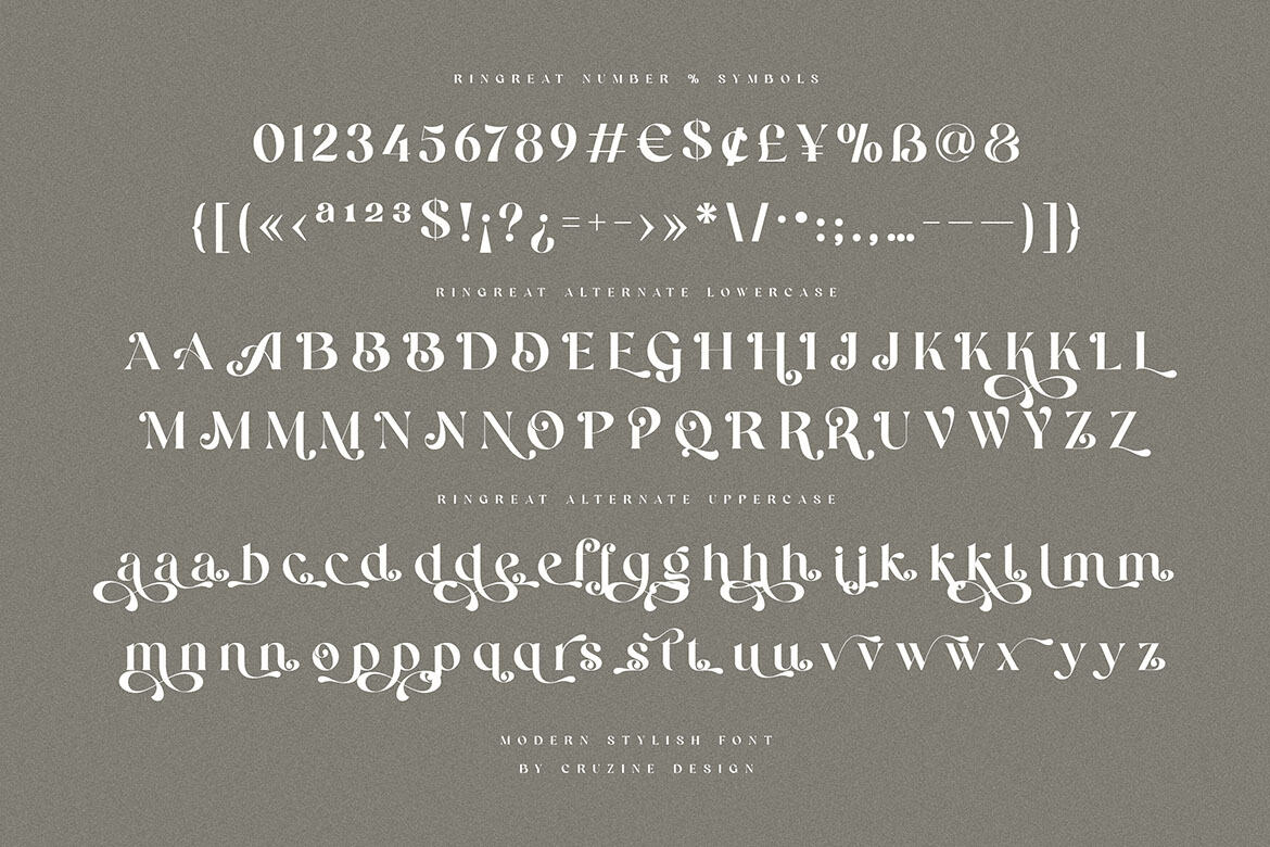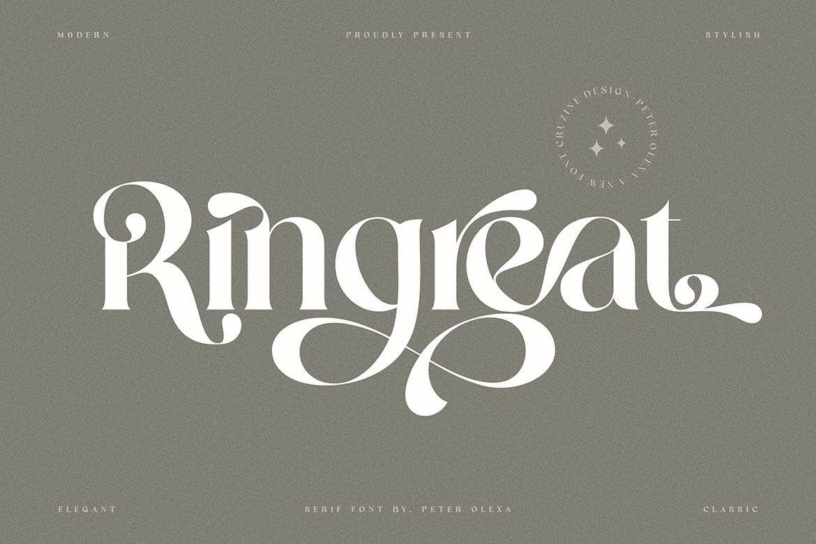 Trendy, bold & modern style serif font for your fancy projects. Elegant, fashion and classic style on Ringreat font will be great for any branding project. Lot of alternates and ligatures will help you to create unique and original logo design or website header! Enjoy 🙂