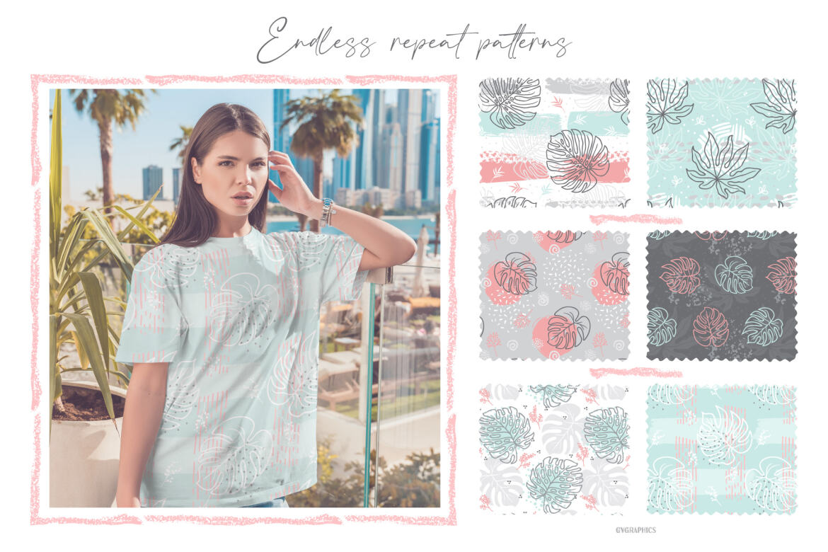 Lovely Summer patterns with palm leaves, doodles and brush strokes in gray, pink, bright blue and white. With these exotic vector backgrounds you can create your own greeting cards, wedding invitations or decorate your gifts, crafts or website! Colorful set of seamless Hawaiian patterns useful for packaging design, all kind of textile, clothing, prints, scrapbooking or web banners.