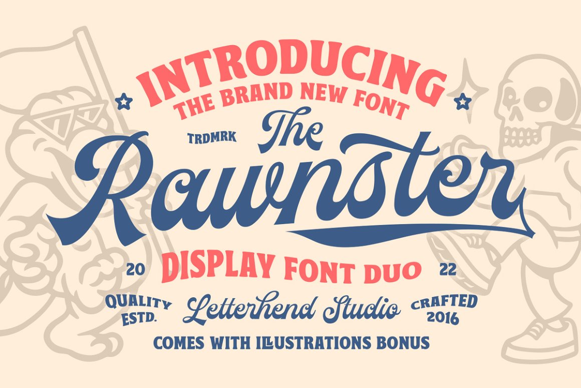 Introducing, The Rawnster Font Duo ! A pair of font with a touch of vintage look and feel. You will also get several retro cartoon character as addition to your project, great to use as t-shirt illustration!