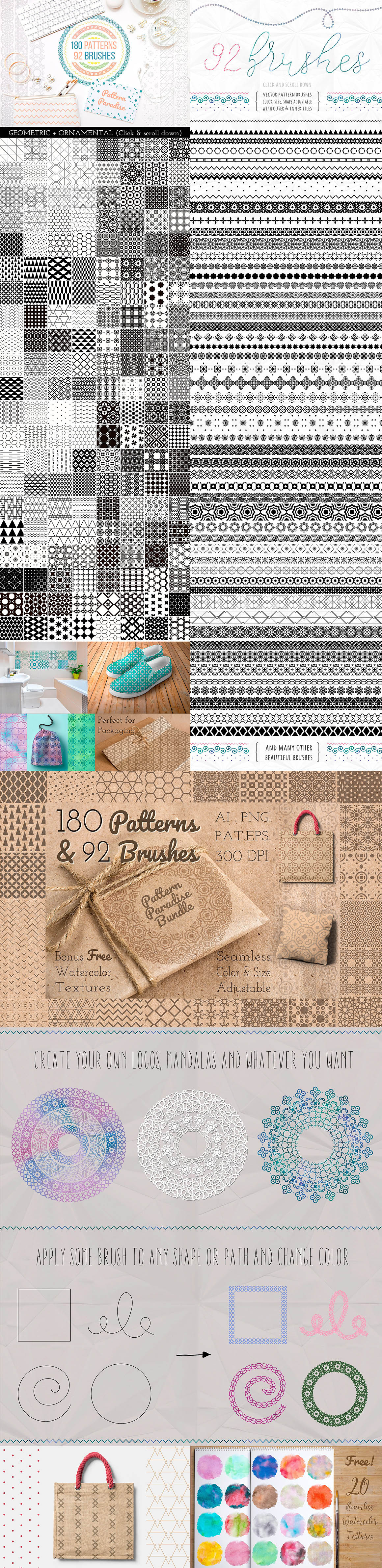 This Bundle includes 180 geometric and ornamental seamless patterns for Photoshop and Illustrator + 92 flexible pattern brushes for Adobe Illustrator CS1+ & Bonus FREE Seamless Watercolor Textures. Patterns are color and size adjustable (vector EPS files). Pattern Brushes are color, size and shape adjustable with outer and inner tiles