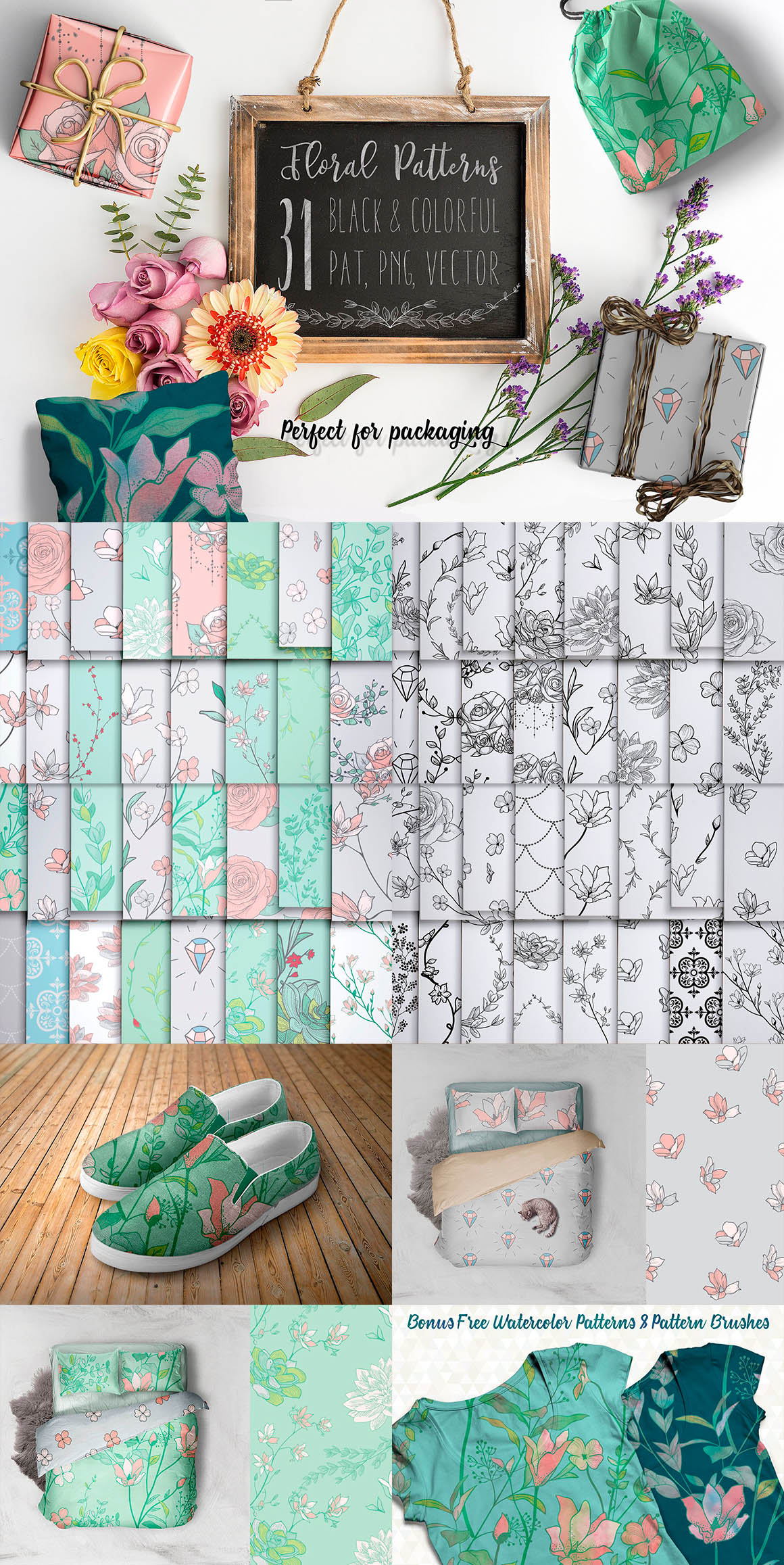 Lush Greenery Seamless Patterns Collection: 33 Colorful + 31 Black Floral Patterns + BONUS FREE Watercolor Patterns and Pattern Brushes for Adobe Illustrator! So You Have 66 Awesome Hand Drawn Floral Seamless Patterns with Herbs, Plants, Flowers, Branches and 16 Pattern Brushes for Adobe Illustrator