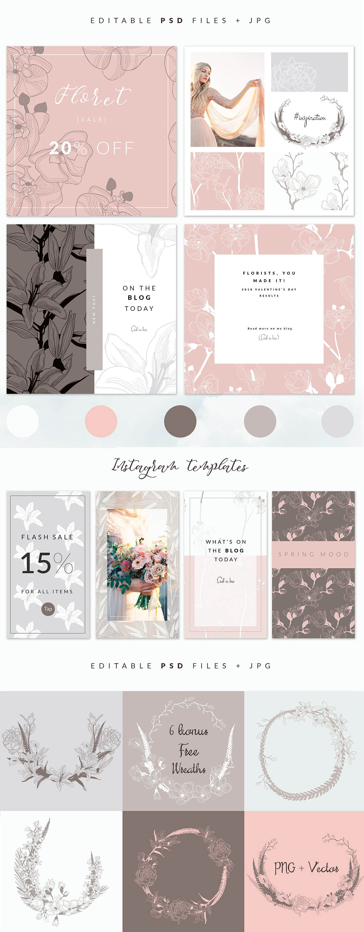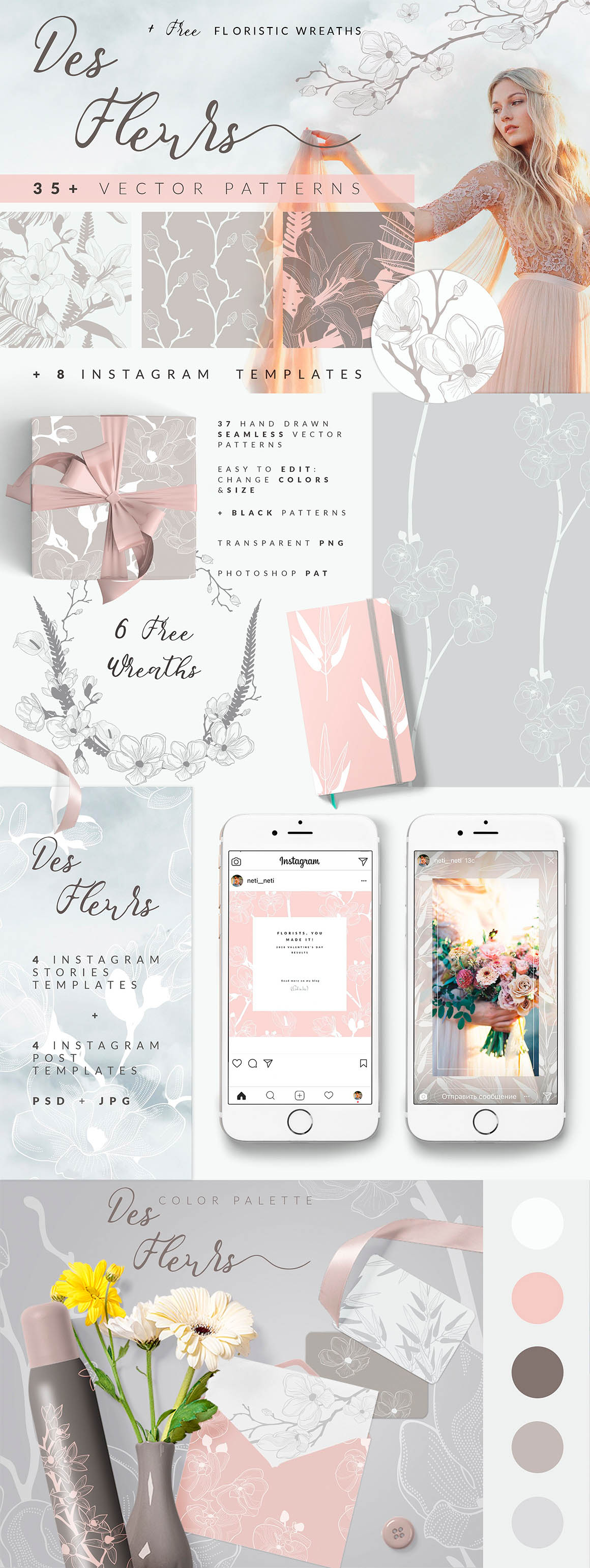 I am so excited to introduce the new very elegant Des Fleurs collection of 35+ Floristic Seamless Vector Patterns + 8 Instagram Templates + 6 Free Bonus Hand Drawn Wreaths. I hope you will love it! Des Fleurs is a gorgeous, very delicate, romantic collection full of elegant hand-drawn floral elements! The patterns are fully editable (through Adobe Illustrator). You can also easily change the colors and size to suit your projects perfectly! You can use them as backgrounds for packaging, branding projects, wedding invitations, fashion apparel, posters, printables or just try them as web backgrounds!