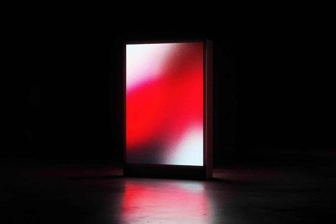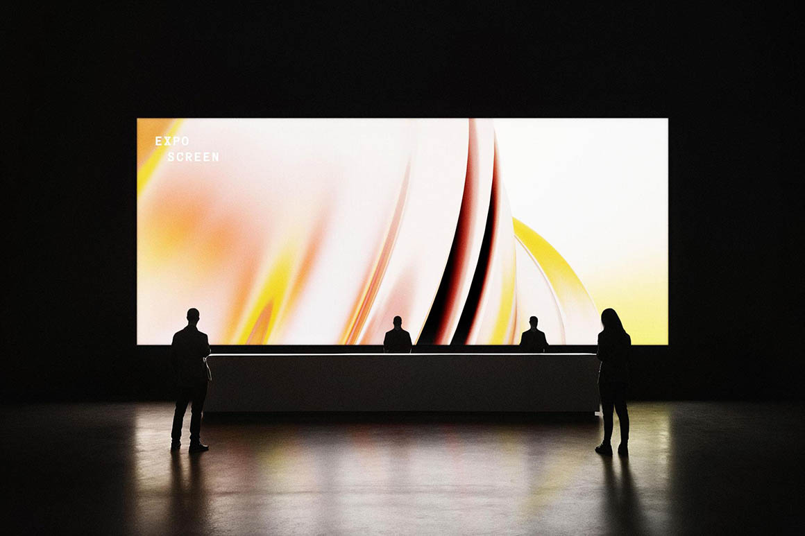 Visuals cover large-format digital signage in authentic, true-to-life settings: curved stage walls, tall vertical kiosks, reception desk backdrops, ultra-wide horizontal screens, busy exhibition halls, illuminated lightboxes, minimalist square displays, and gallery-mounted screens.