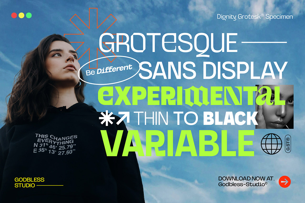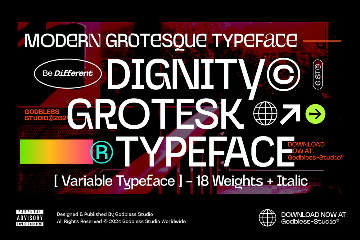 Dignity Grotesk – Variable Font from Godbless Studio contains 18 multilingual fonts for your new modern or futuristic projects! Don’t miss this trendy & sharp style branding font 😉