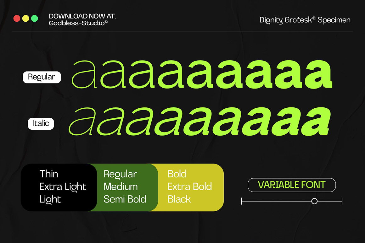 - Dignity Grotesk Variable Font – trendy & modern typeface with 9 weights + italic