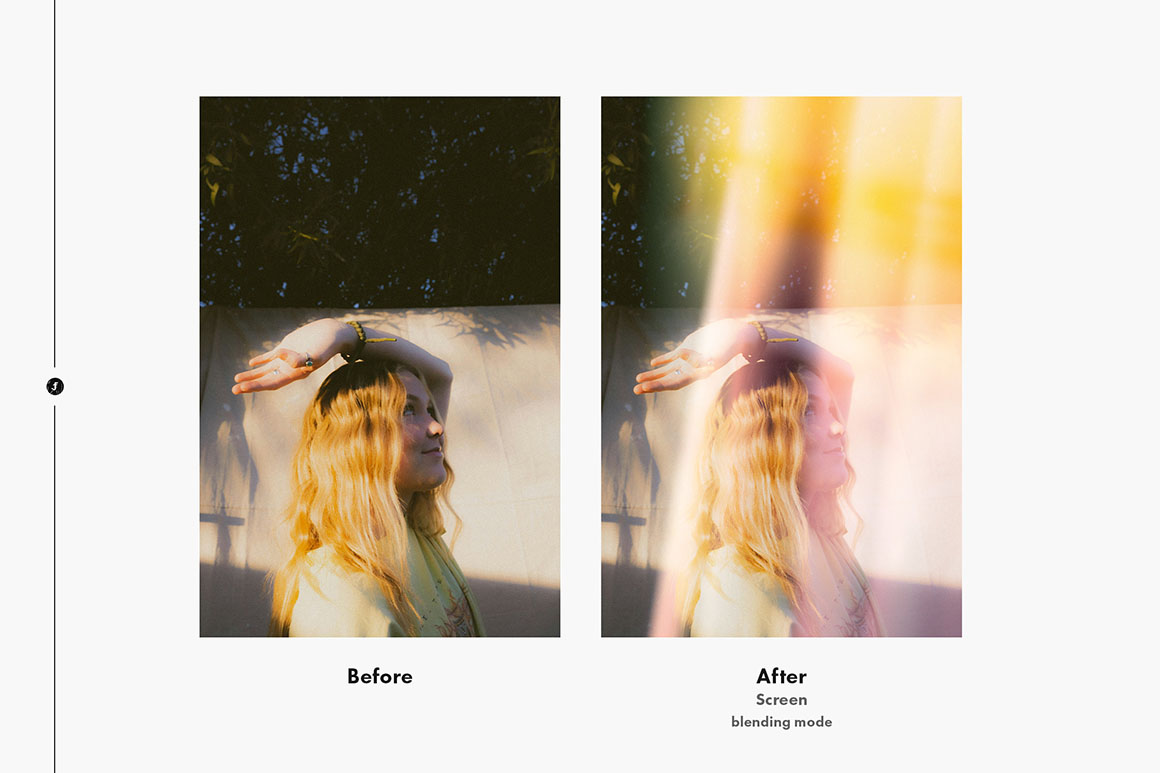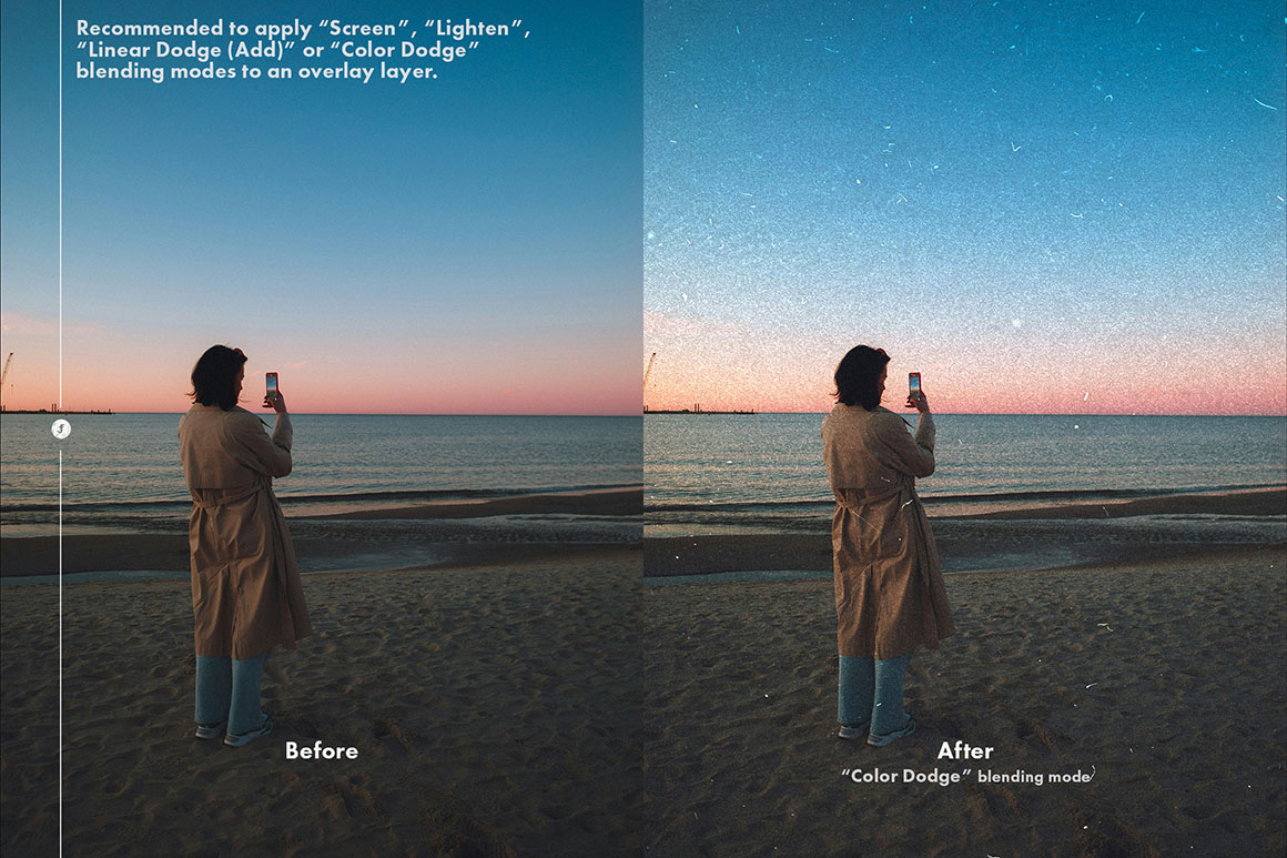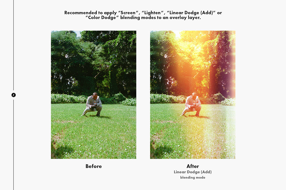 How To Use: Simply place the overlay on top of your image, change the mode of the overlay layer for “Screen“, “Lighten” or “Linear Dodge(Add)” and that’s it!