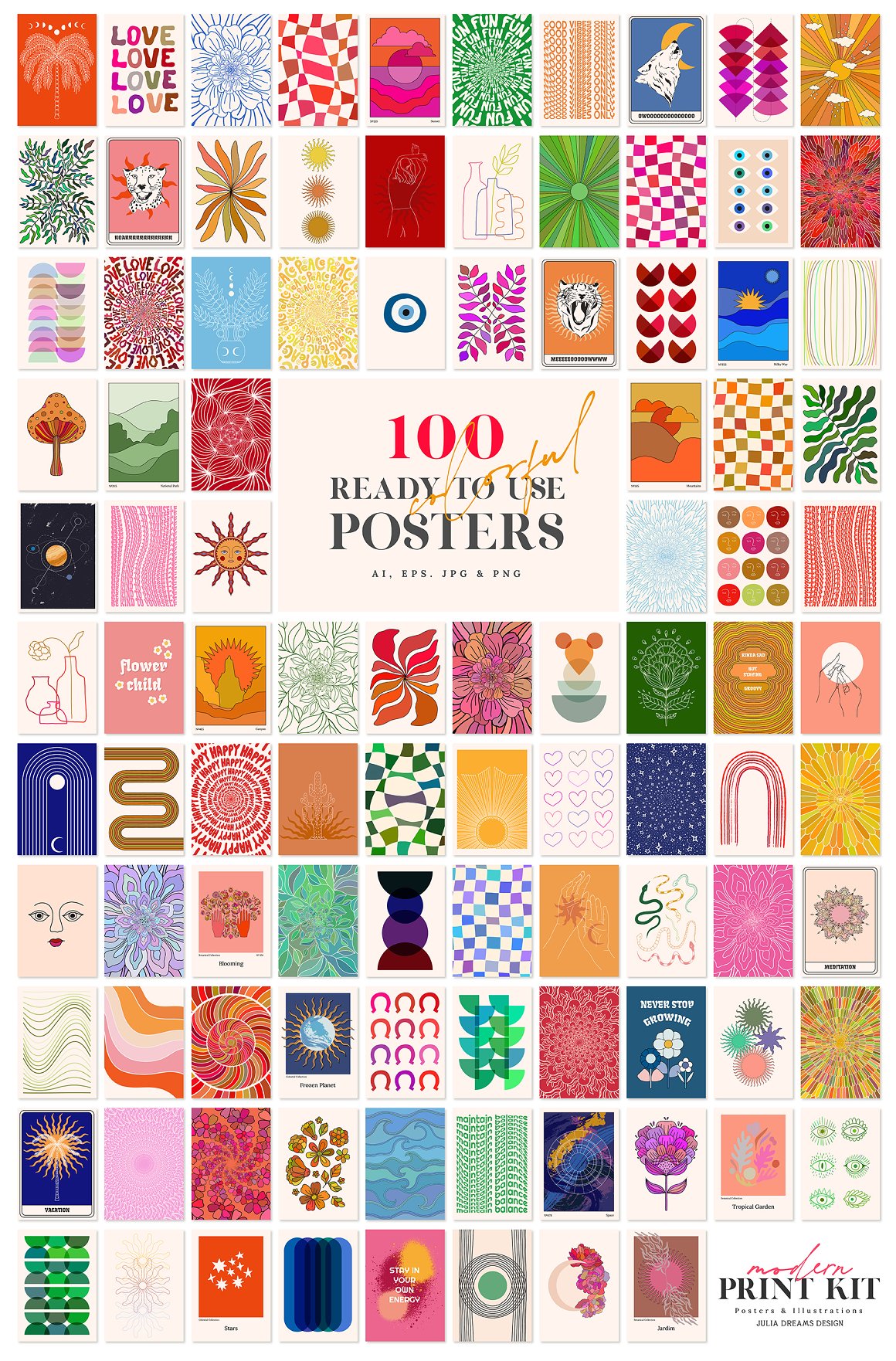 - 100 Ready to Use Posters (5167×7308 px, 300 dpi) – ai, eps, jpg and png with transparent background;