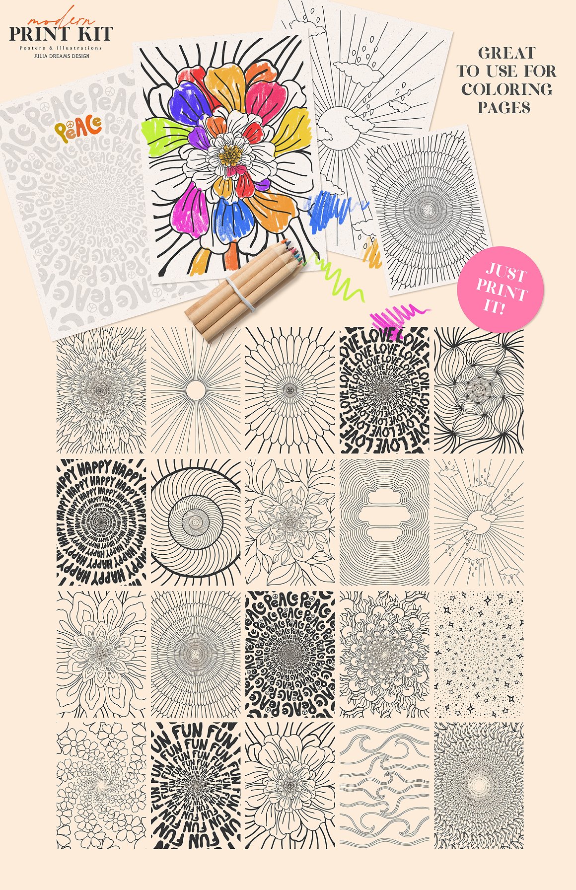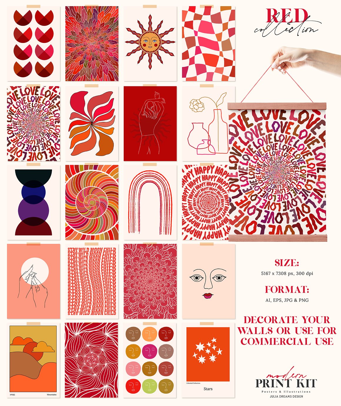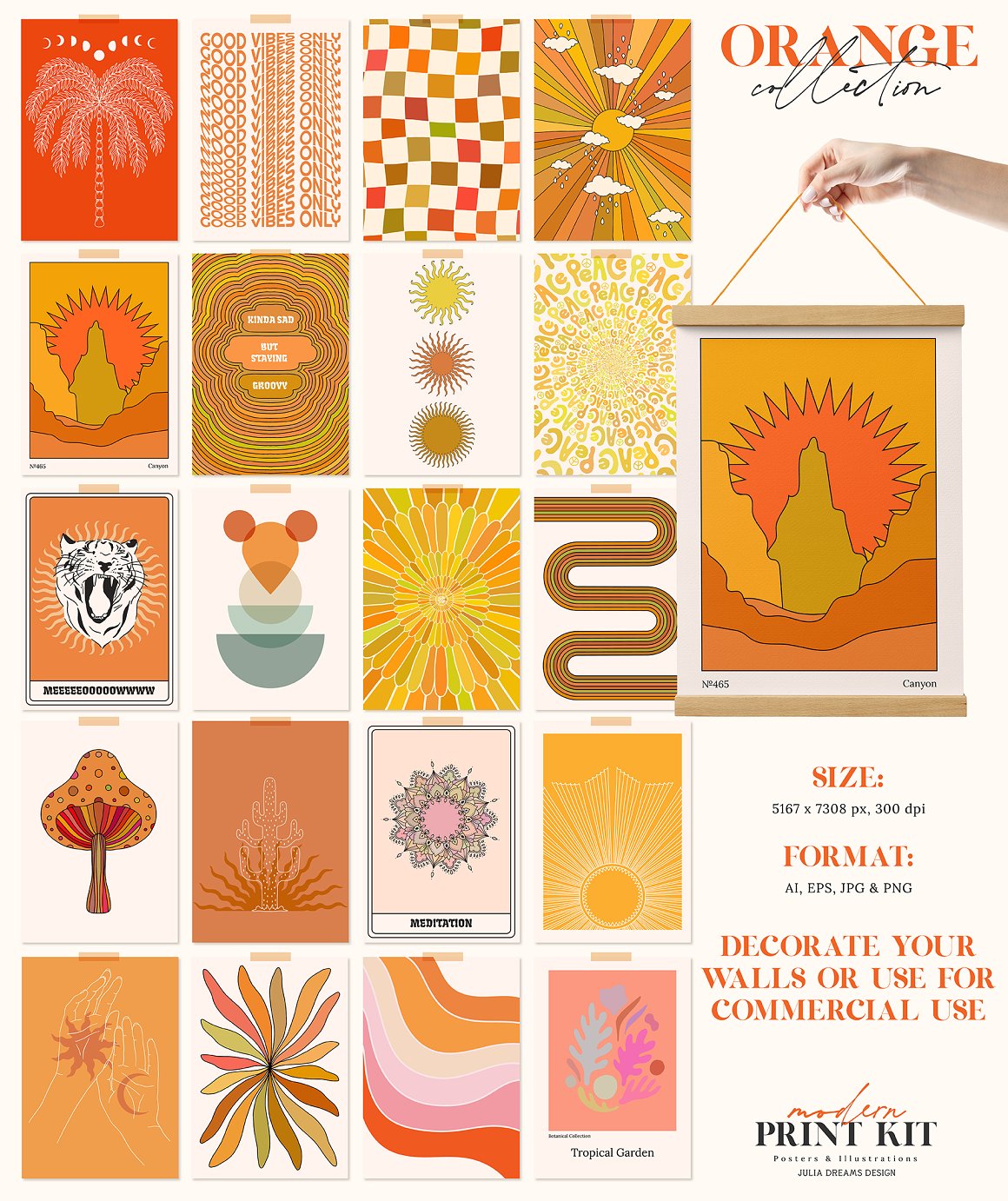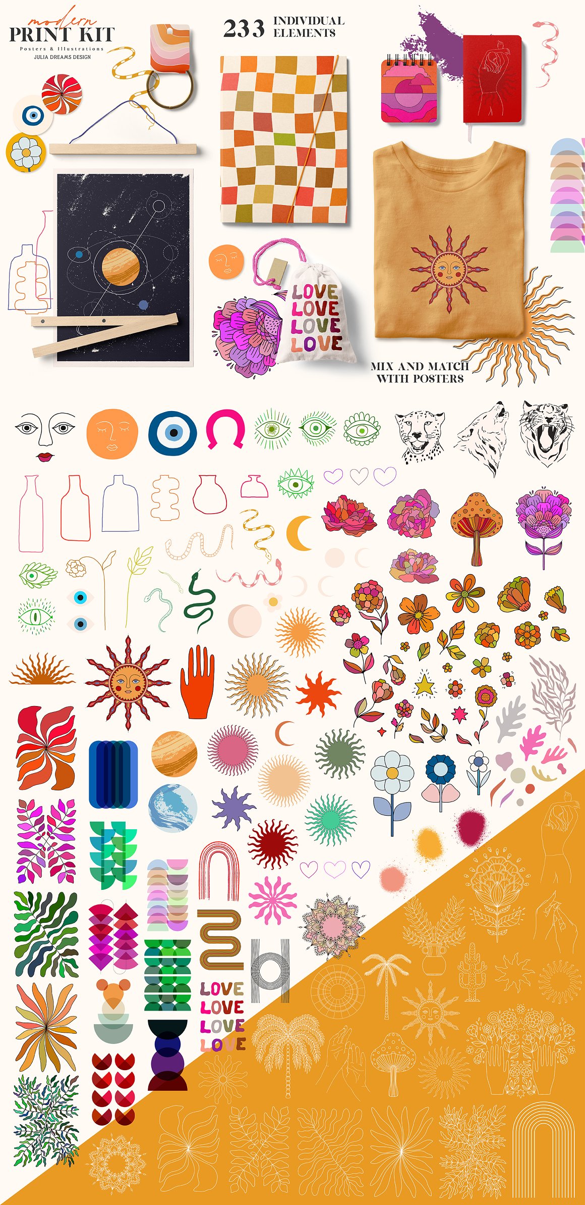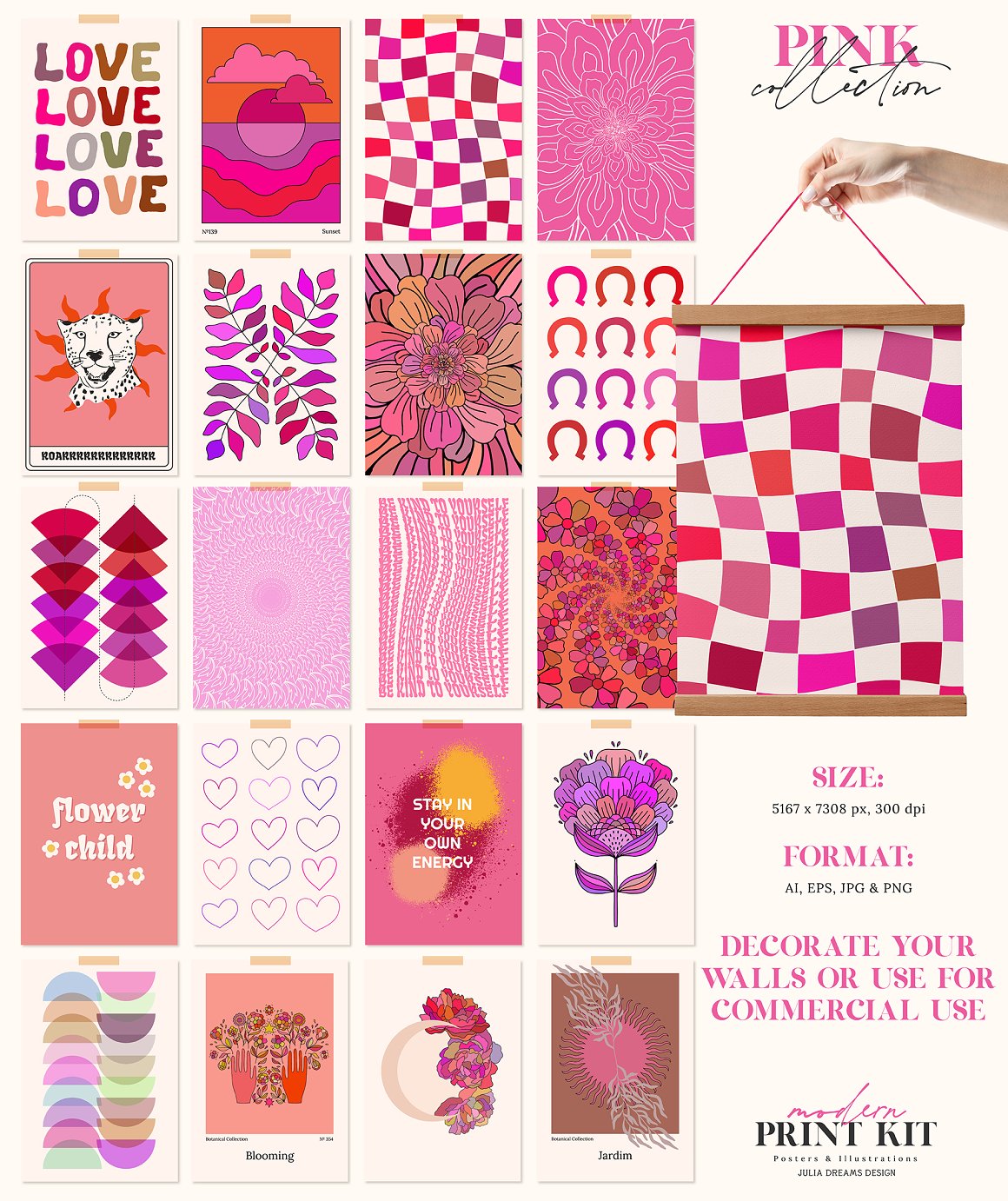 All these cool hand drawn graphics from Julia Dreams are ready for print or online use! MAIN USAGE: flyers, posters, greeting cards, branding, packaging, phone cases, bags and totes, wall art, fabrics, t-shirts, website backgrounds. Actually any place you love! Enjoy 😉