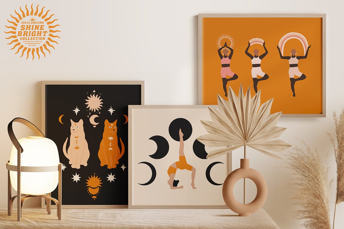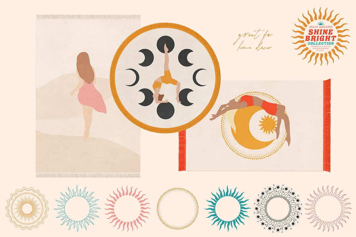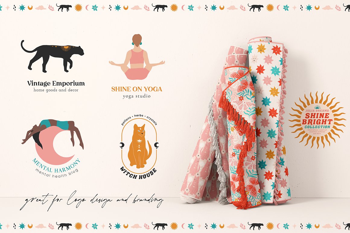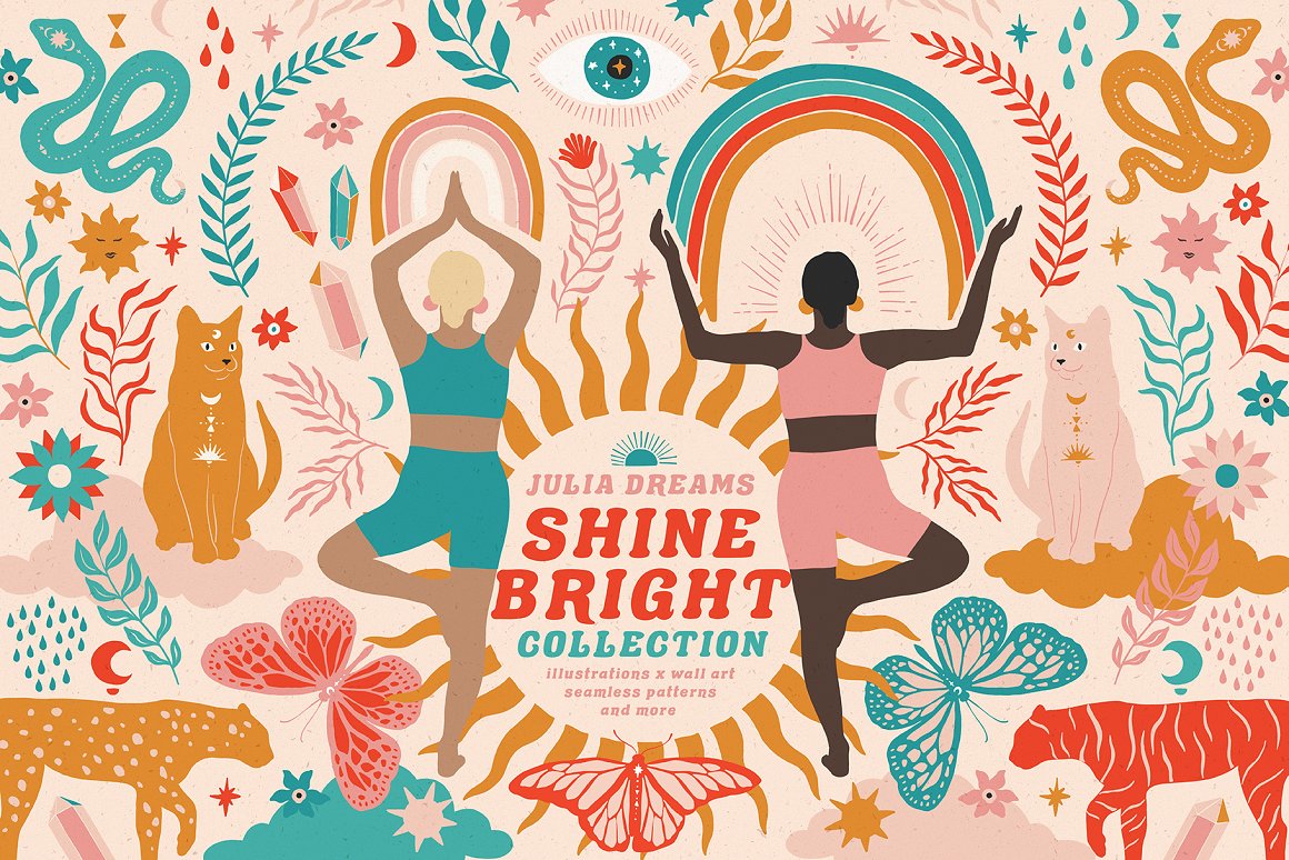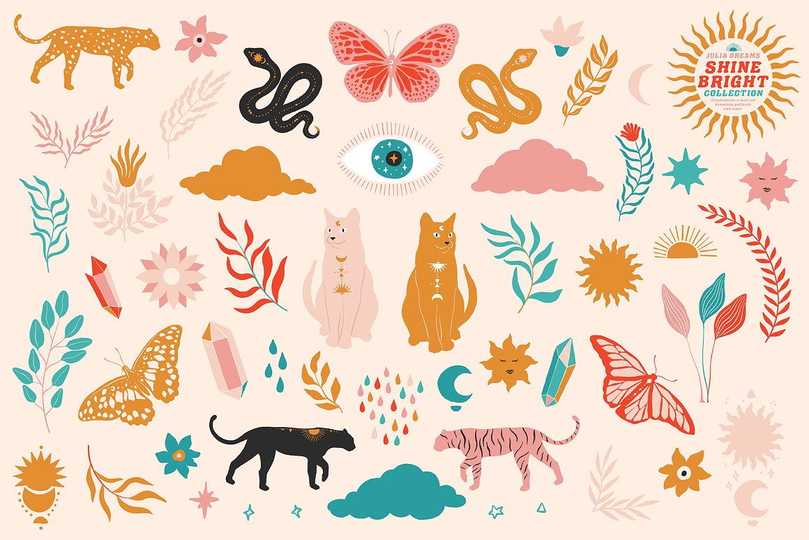 Shine Bright Collection great for logo, posters, cards, branding, covers, gifts, social media accounts, wrapping paper, wallpaper, fabric, scrapbooking, stickers, sites, blogs, invitations and much more! Compatible with Illustrator, Photoshop, Procreate, Affinity Designer & Photo, Canva and with any graphic editor, including Sketch, Microsoft Powerpoint and more.