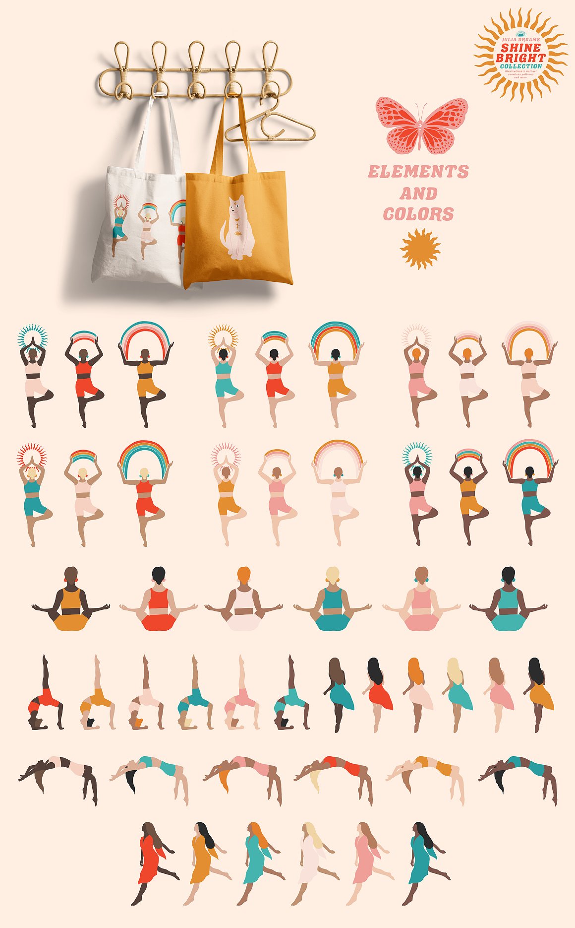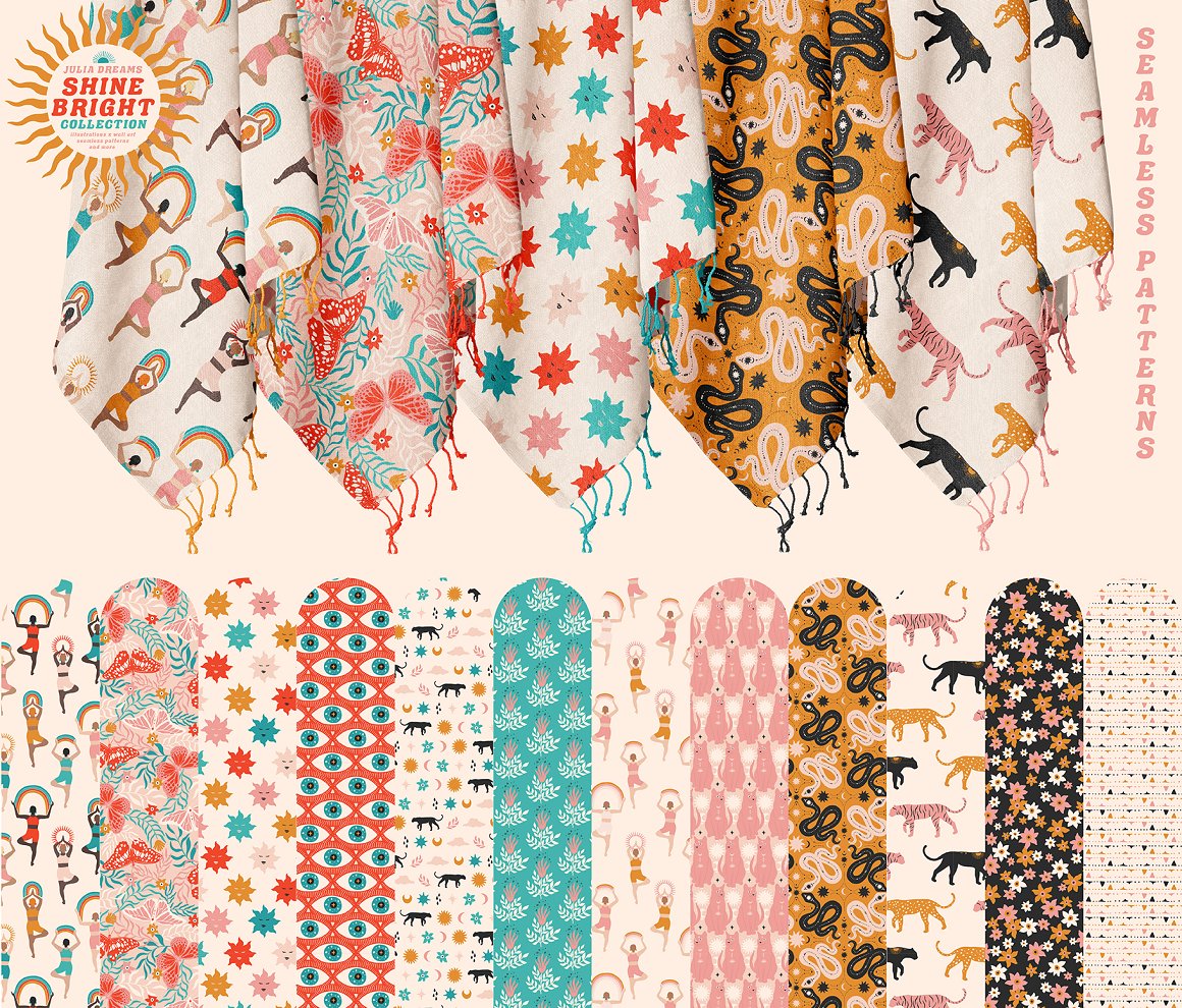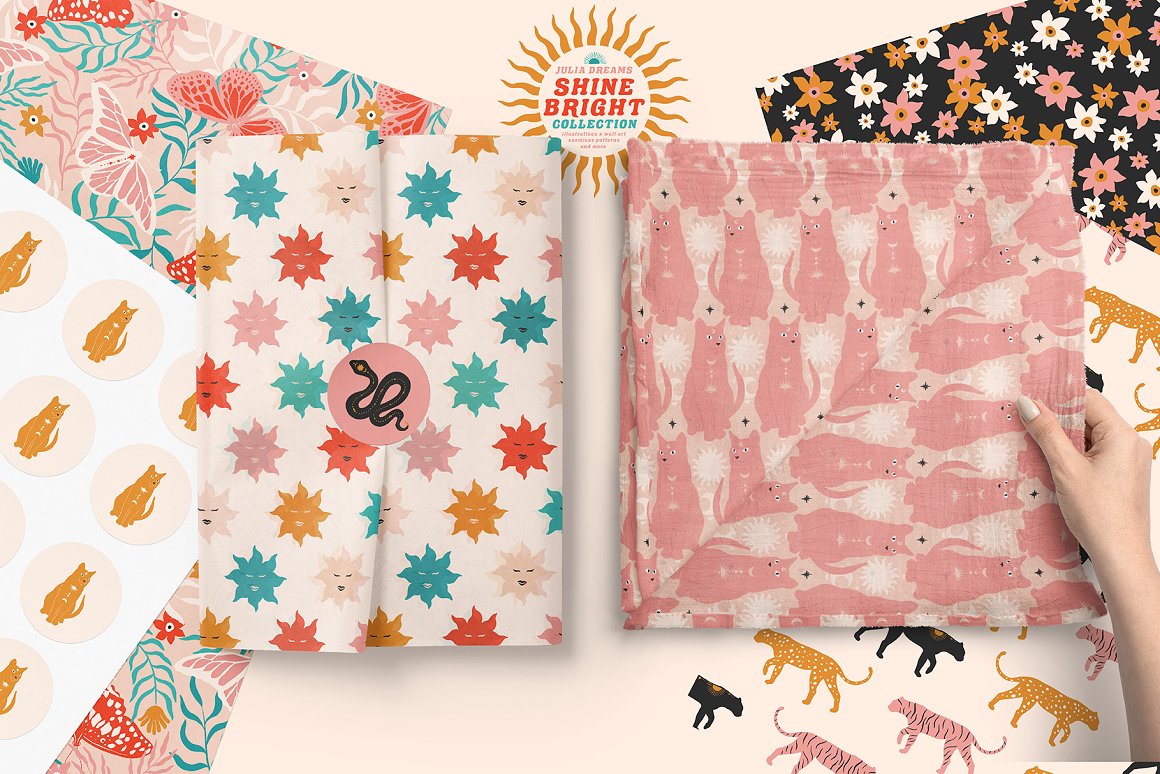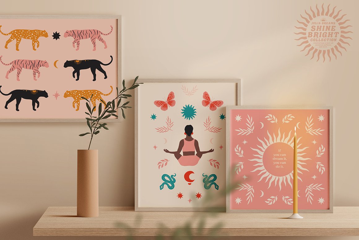 Shine Bright Collection great for logo, posters, cards, branding, covers, gifts, social media accounts, wrapping paper, wallpaper, fabric, scrapbooking, stickers, sites, blogs, invitations and much more! Compatible with Illustrator, Photoshop, Procreate, Affinity Designer & Photo, Canva and with any graphic editor, including Sketch, Microsoft Powerpoint and more.