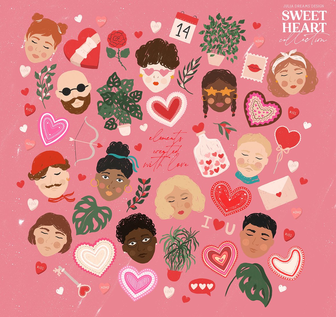 Sweetheart Collection. Happy Heart Day! Created with absolute love, modern and vibrant graphic resources for this beautiful day of love! All these elements can make a special atmosphere in your project: from wedding to stationery branding, from logo to posters and postcards. This collection was carefully crafted and great attention was paid to details. It consists of different pre-made elements, compositions and seamless patterns that can be used individually or combined with other elements.