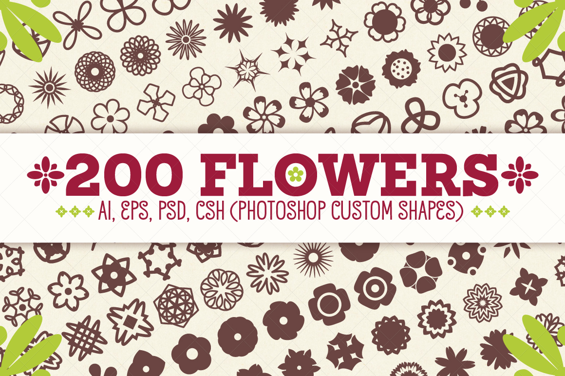 200 Flowers – Vector Shapes/Silhouettes/Symbols A set of vector flowers that can be used in any project for decorations. Just rotate, scale and color the shapes to fit your design. Format: Vector Ai, Vector Eps, PSD made with vector shapes, CSH (Photoshop Custom Shapes).